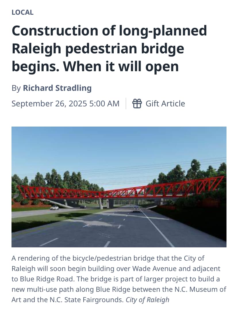 Unrelated, but the Blue Ridge Rd. predestrian bridge now has 2 small cranes being set up on each side of Wade Ave, in addition to the larger one in the median. Hopefully going to see some actual bridge start being made.
