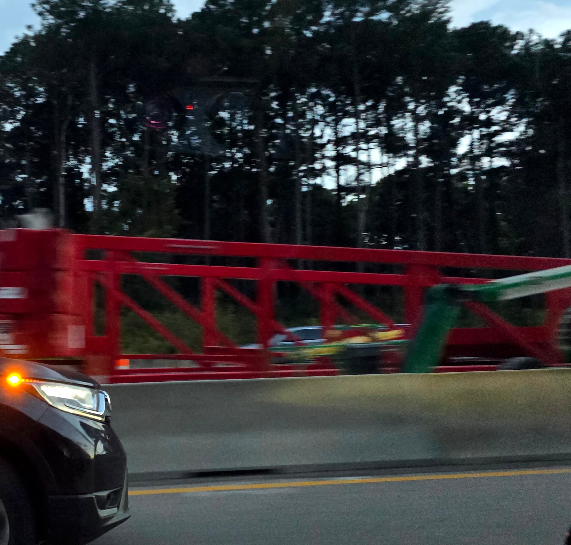 Pedestrian bridge is staged to be lifted into place. It looks good! And red! Looks like it’ll be a nice entry into town.
