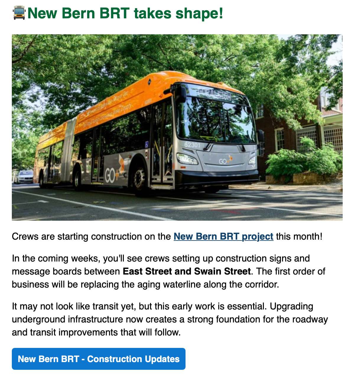 I just saw a sign on New Bern saying there will be construction from East to Swain beginning on February 16th (next Monday). Hopefully this is the start of the BRT construction!