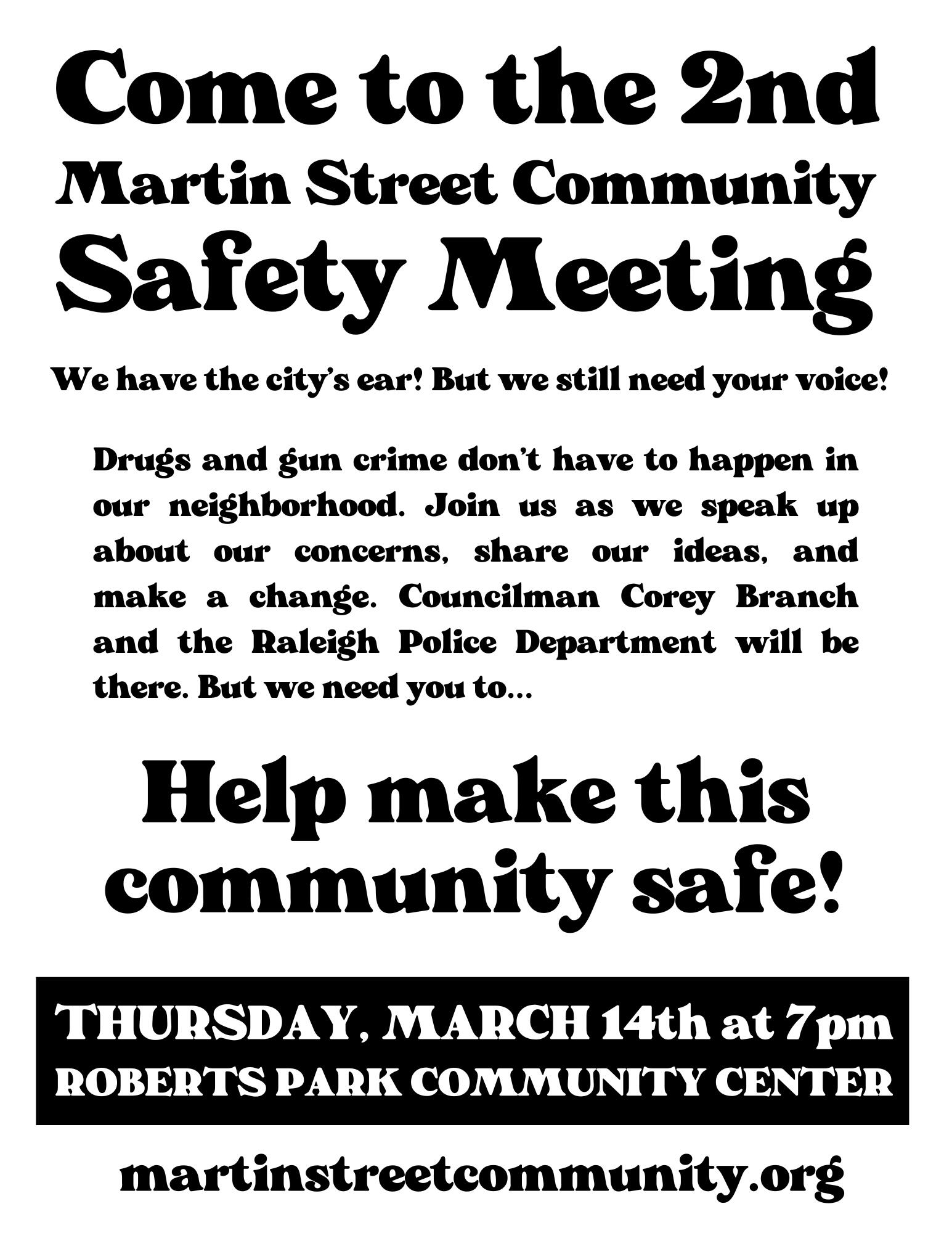 Hi everyone. Hope you don’t mind me posting again about another safety meeting for the Martin Street neighborhood. Just had to call 911 today on two guys beating up a half naked, drugged out woman two houses down from me, so I feel like this is still relevant…