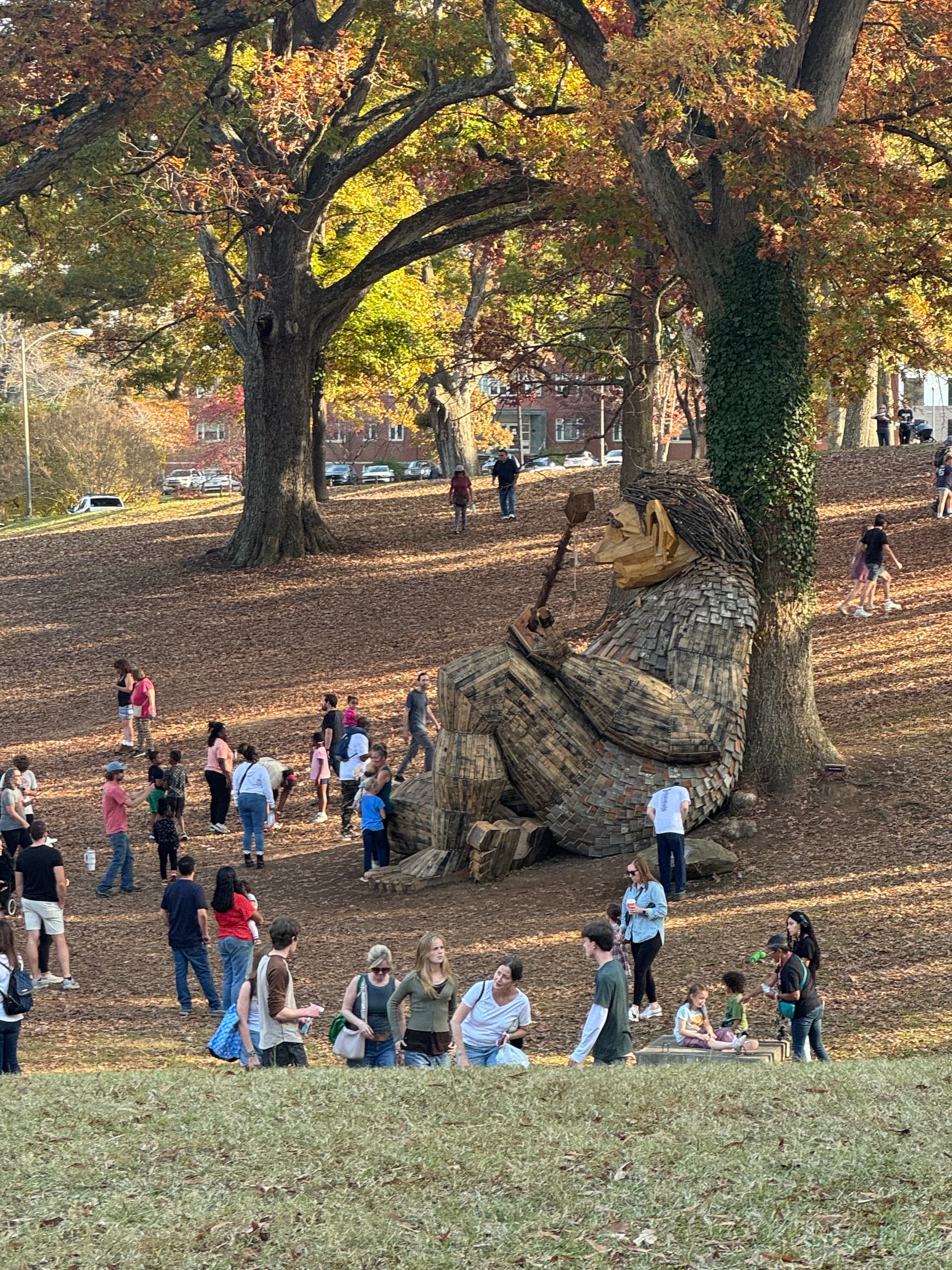 I made it to Dix to track down the trolls this weekend. I went via bike but felt like I was back in 10th grade on one of those old simulators for drivers ed. People, cars, bikes, dogs, kids all pulling out in front of me here there and everywhere. I have never seen so many people and animals enjoying a day at the park. It was heartening. With the Gipson Play area and now the trolls, I see positive days ahead for Dix Park.