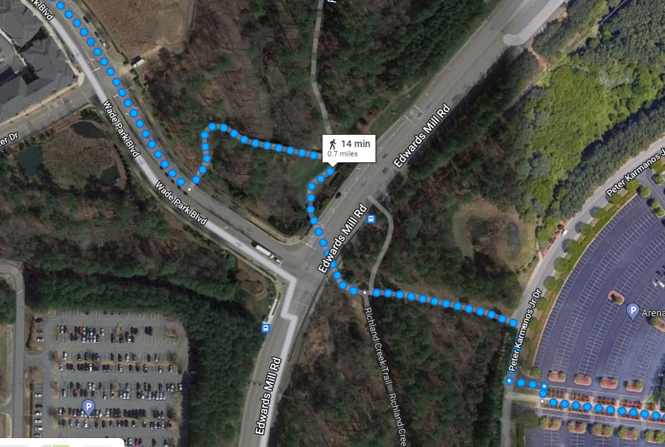 As for the tunnel, see below! No crosswalk on Wade Park Blvd between Edwards Mill and the roundabout, so make sure you stay on the northern sidewalk coming down the hill. Oh, and the Edwards Mill/Wade Park intersection remains fully open and operational during events (as does GoRaleigh 26 because I complained about them rerouting it a couple years ago).