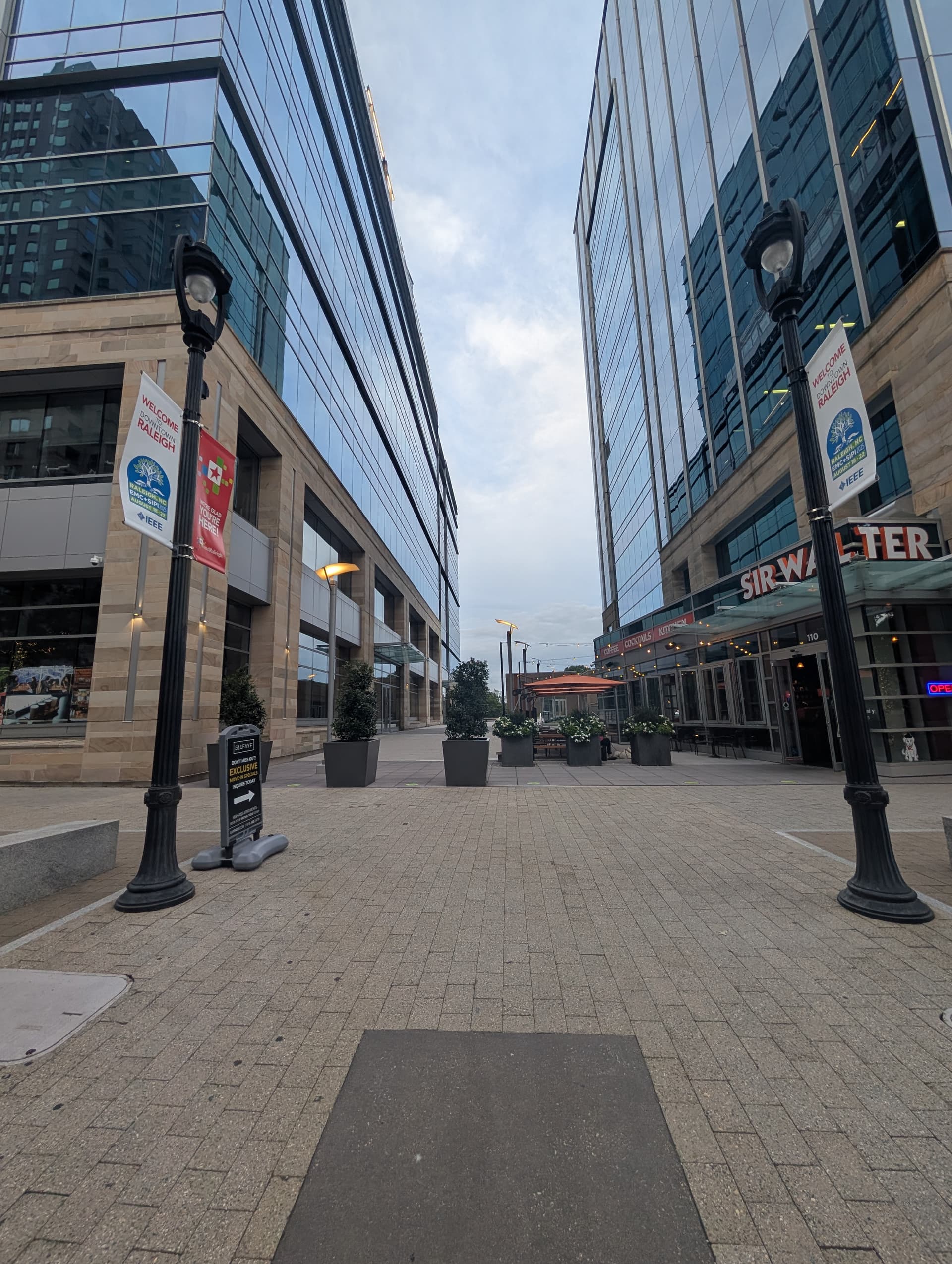 Next to the business probably makes a bit more sense for larger streets like Fayetteville Street. I think the model where you have tables for the business farther out is typically for smaller sidewalks.