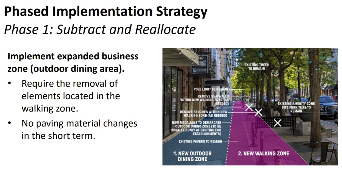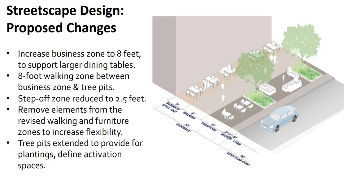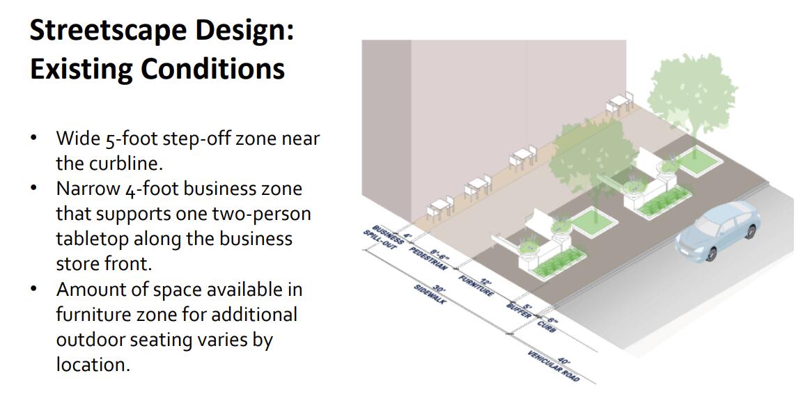 Latest update on the streetscape plan. There were a few “possible in the future” things proposed but the one thing that was discussed the most was the outdoor dining piece. Businesses want outdoor dining to be against the building, not on the other side of the walking path along the sidewalk.