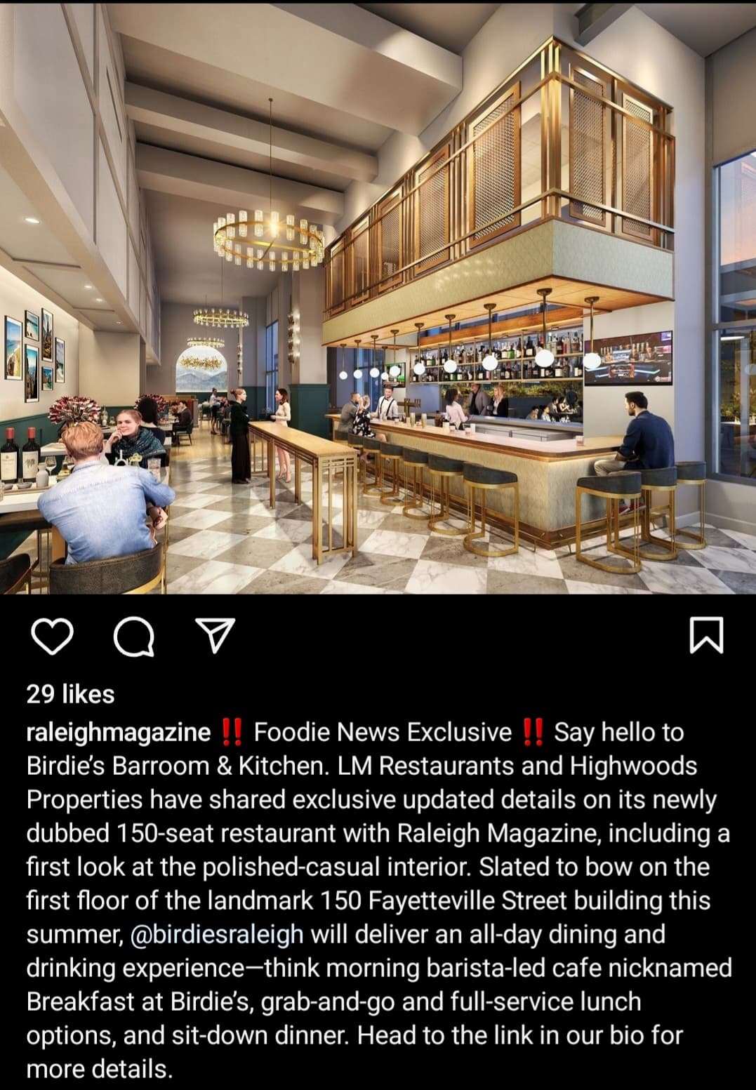Here is the link to the article in case anyone is interested in reading more: Exclusive Details on LM Restaurants’ Birdie’s Barroom & Kitchen