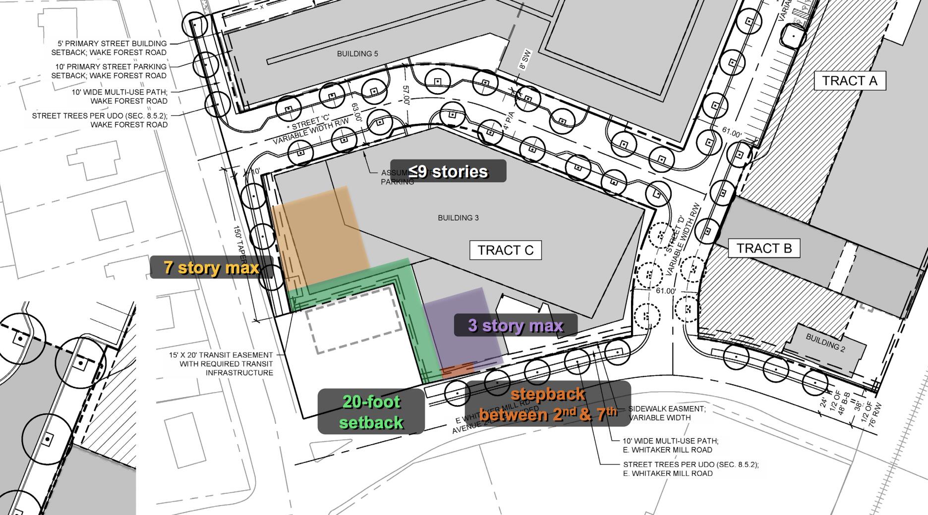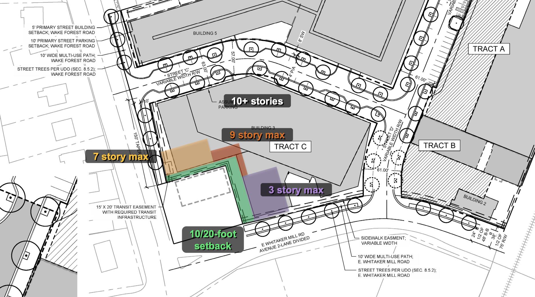 Two sets of rules will be debated. One’s for if the building on Tract C is 9 stories tall or less: