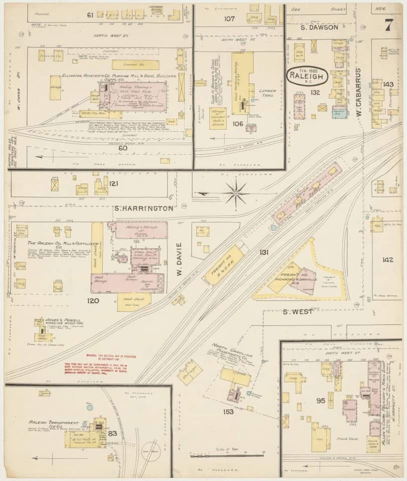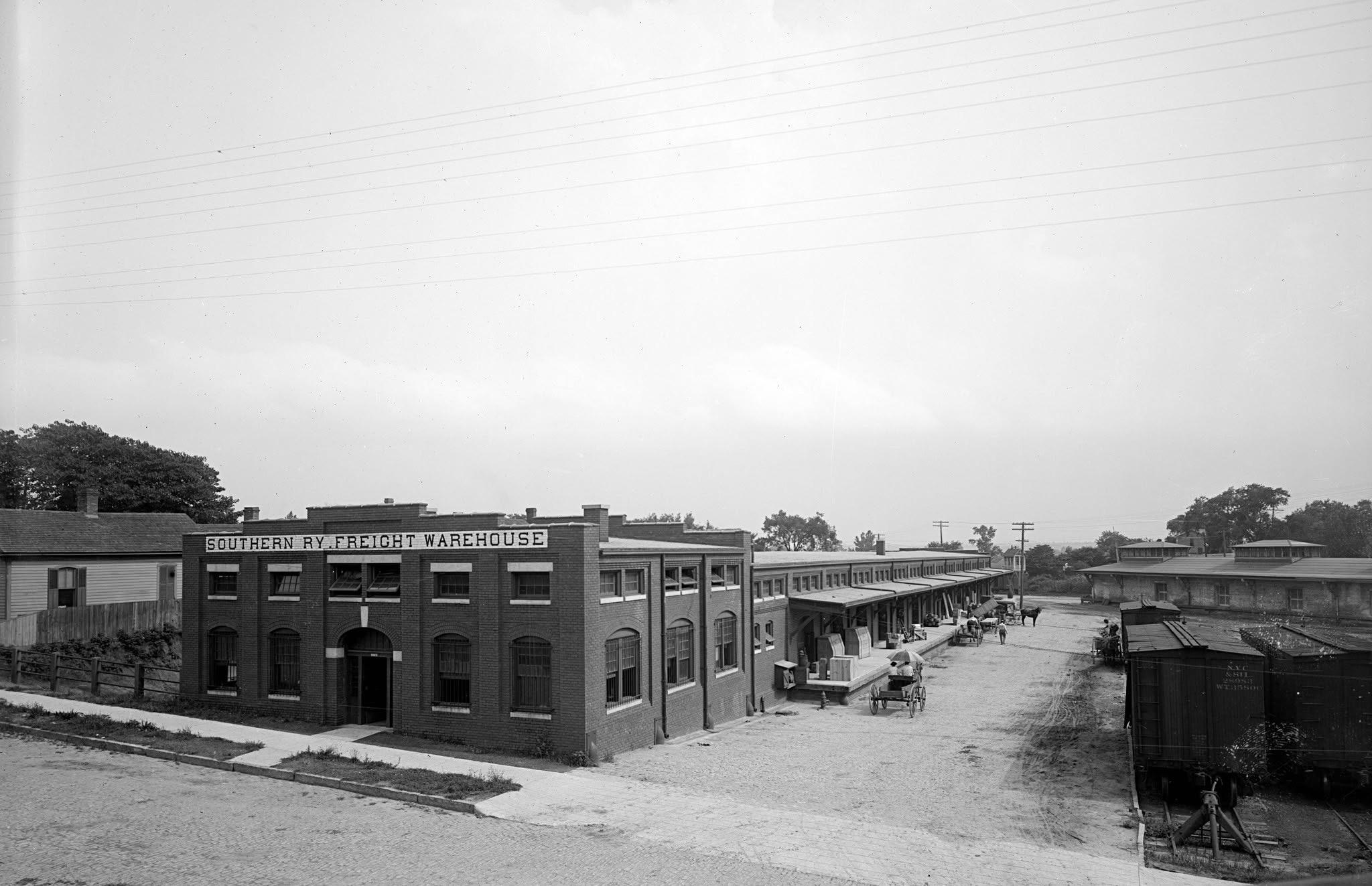 Included is a Sanborn map showing the exact location of that depot, standing at Cabarrus Street. And, Albert Barden captured it in the background when photographing the Southern Railway Freight Depot.