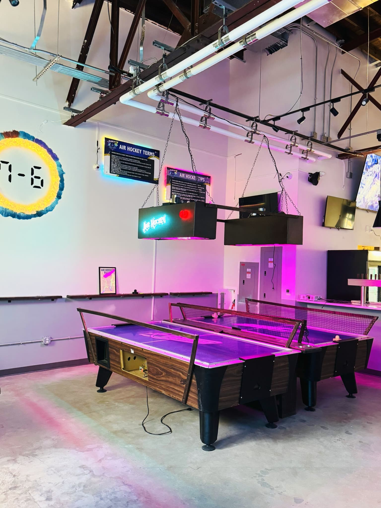 I think the stark white walls don’t do it favors - some paint and/or art/decor covering the walls would have more of a retro/arcade feel - but that can be developed over time.
