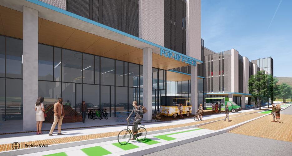 The original intention was for ground-floor retail, but it doesn’t look like we’ll get it, so we’ve instead removed one bay of parking to widen the sidewalk and create a deep overhang. The intention is to create an opportunity for food trucks, market stalls, artists, and other “pop-up” vendors to set up shop on a short-term basis. We’ve also been purposeful in breaking up the massing so that it’s not a flat facade along the street. There’s a public atrium in the middle that houses the elevators, which creates a clear entry point to the garage and a natural break in the mass. We were also able to push back one bay of parking on the top floor (the right side of the rendering) which gives the appearance of a step down in the building height (so from the street, 2/3 of the deck appears to be 5 stories tall, and 1/3 of the street front appears 4 stories tall, with no impact to parking counts).