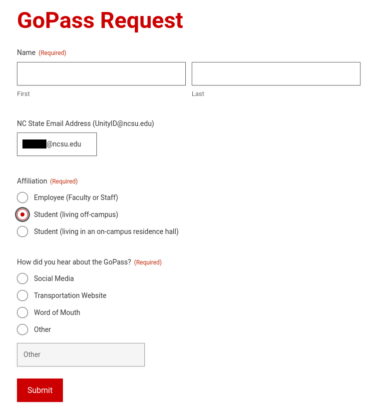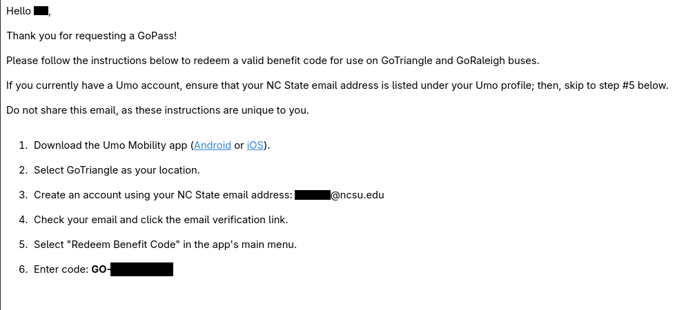 For the NC State GoPass, you have to sign into a portal to get a benefit code you redeem in the Umo app. A little more involved than UNCC & CATS, but once you set it up, it’s set up for the remainder of the year. And it still only takes a couple of minutes, not something you have to “request” and wait a response for.