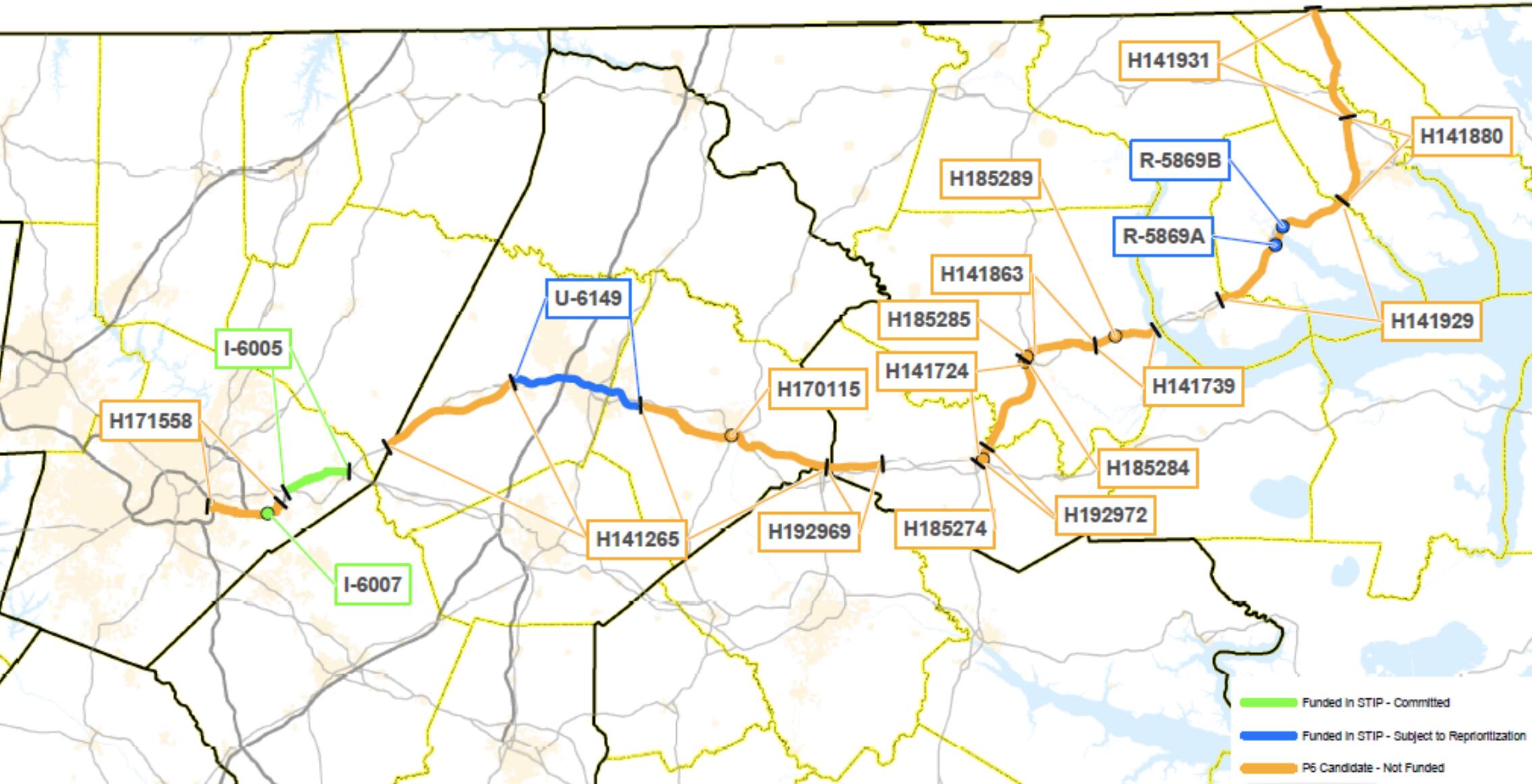 The RTA blog post also links to a map of the corridor in North Carolina’s side of the border, with projects of various levels of commitment (see below). The upgrades in orange places aren’t funded yet, whereas NCDOT has committed to fund the ones in blue. H171558 (the one in Raleigh) is aimed at widening the current US64 (for an HOV lane, I hope?).