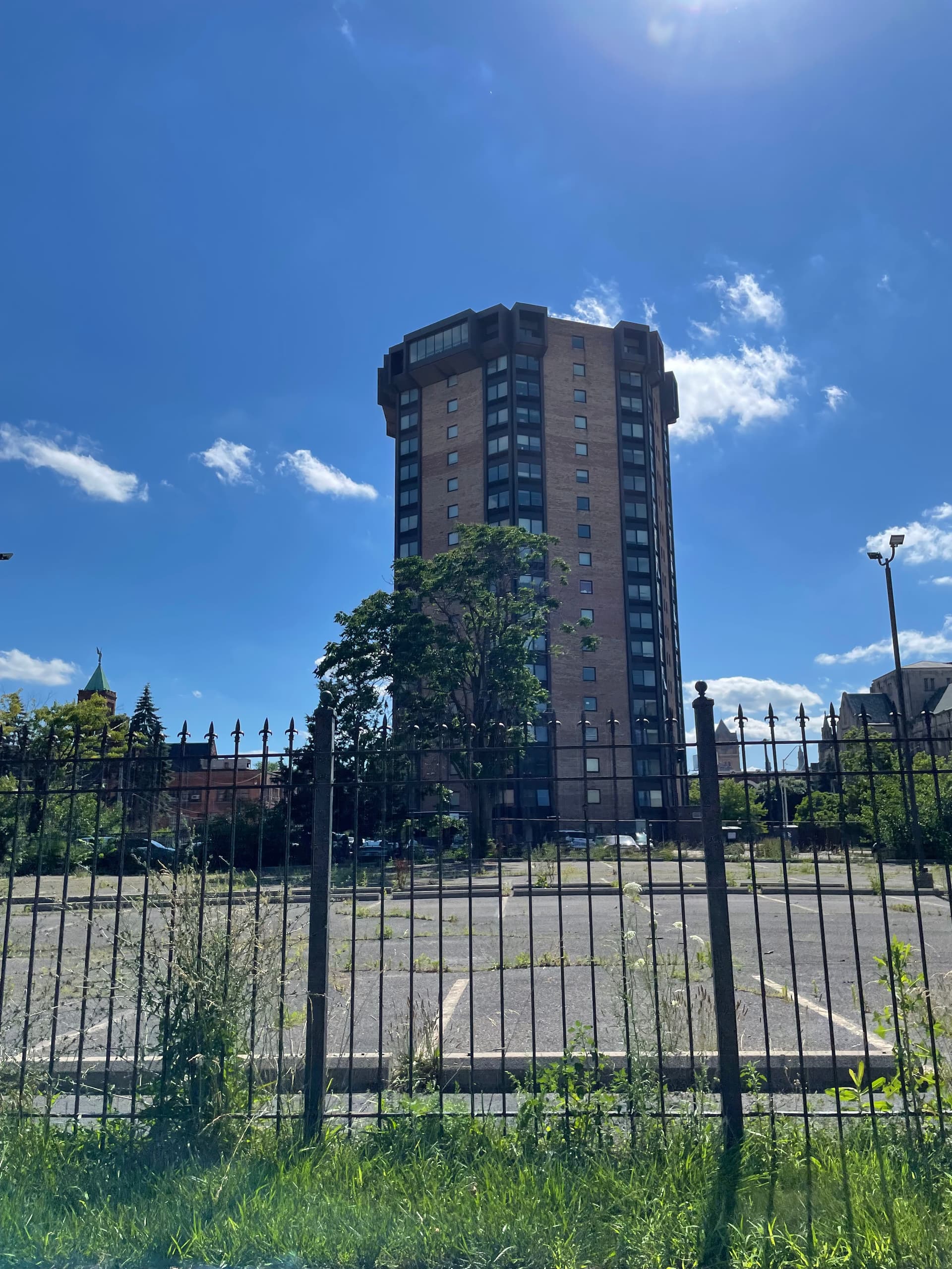 I evaluated that adaptive reuse concept multifamily concept at my previous firm. Last I heard, there were still unresolved ownership issues—some of the units are held by different entities, which has stalled any progress of it even being torn down. The building itself has suffered significant damage from vandalism and prolonged neglect (the inspection report was fascinating to review), and the pizza-slice-shaped units make it a tough fit for many redevelopment approaches.