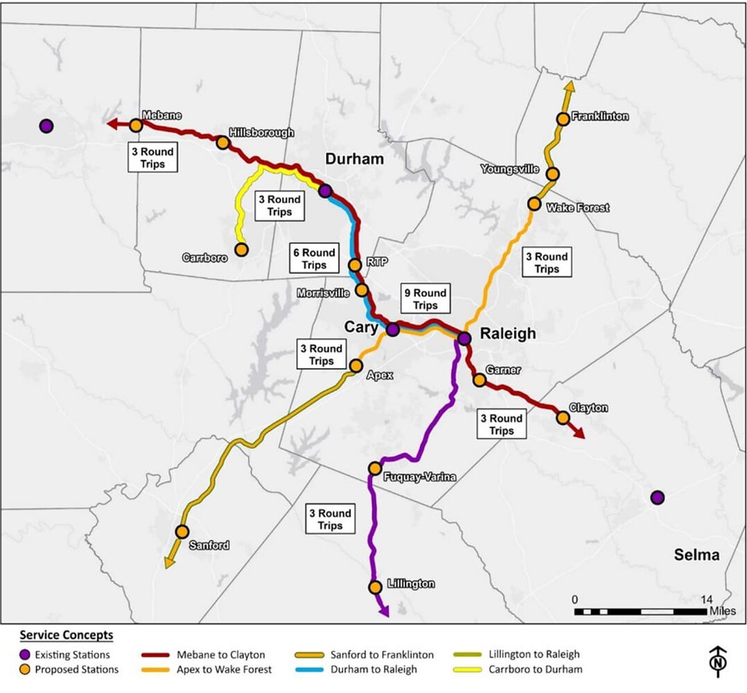 A CAMPO meeting scheduled for tomorrow will talk more about the Triangle Rail Study’s recommendations on how to incrementally work towards a regional rail system. A lot of it clarifies what I reported on earlier, but there’s some additional context and data that’s still interesting.