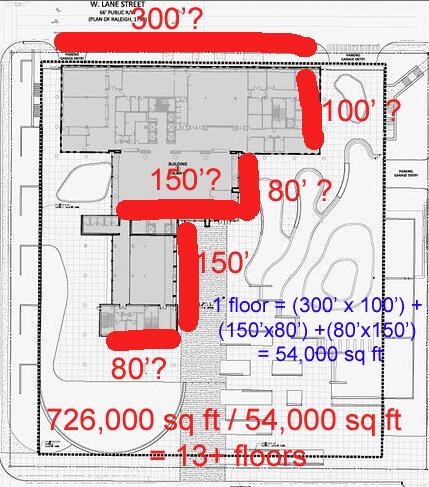 All that added up gets you 54,000 sq feet per floor, and if you need to get to 726,000 sq feet, that would take just over 13 floors. Am i missing something? Am I way off? If I’m anything close, it would explain why the cranes are so tall…this won’t be 6 or 7 stories.
