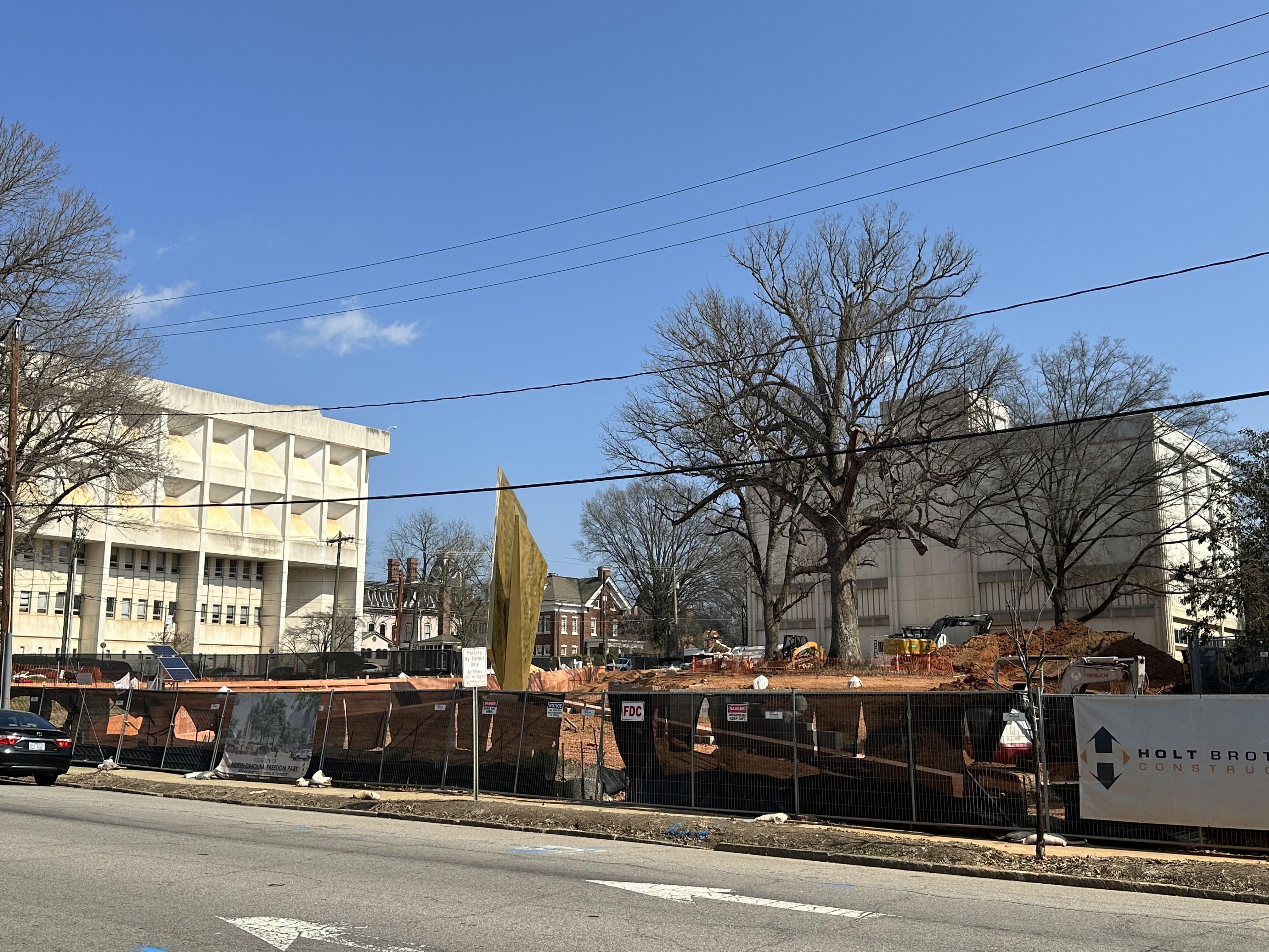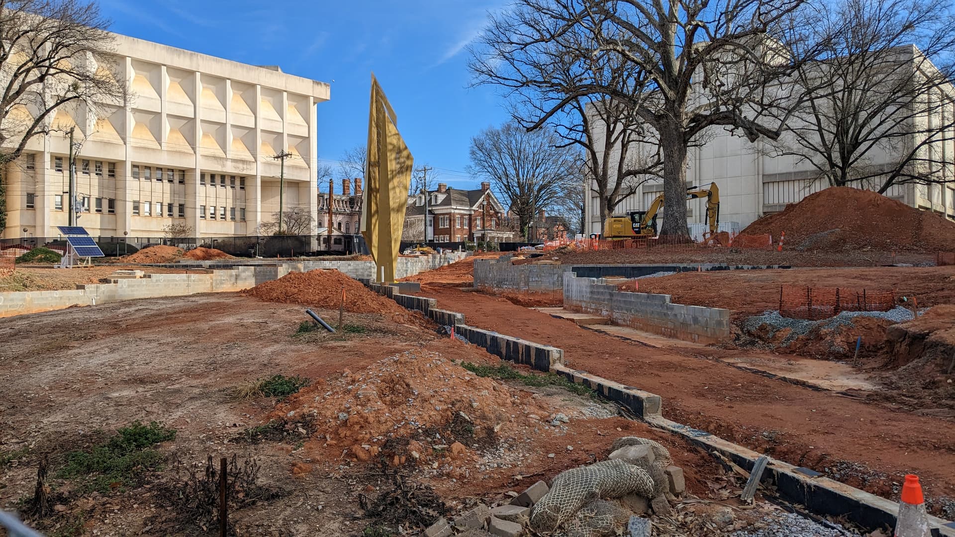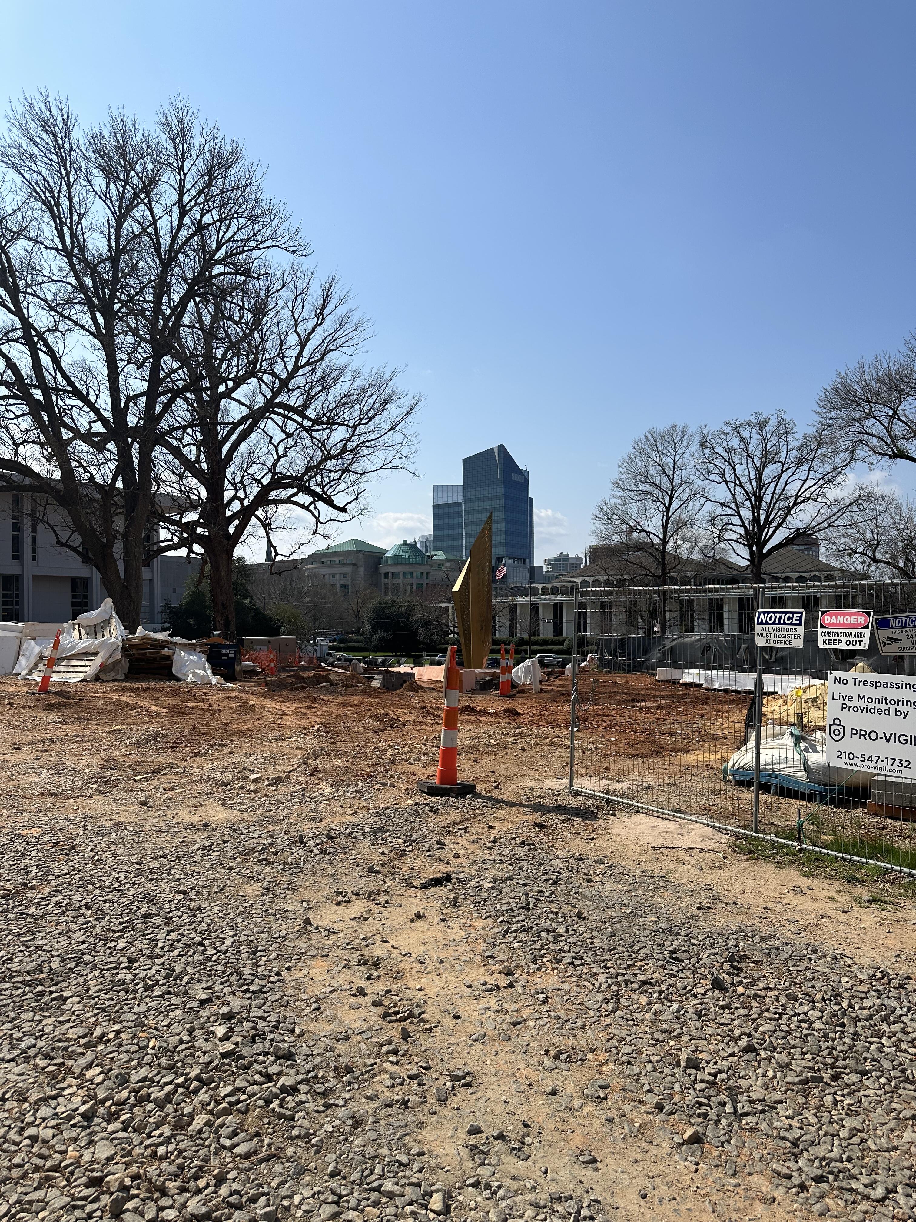 Morning sun is hell on this angle, but they’re back to digging out paths, this time on the NE side. Doesn’t look like the precast concrete is here yet, but they’re getting everything else as far as they can.