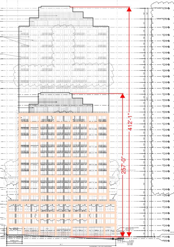 Guess would be 257 ft based on the previous plans which they don’t seem to be completely scrapping. Almost exactly the height of the Civic Tower (258 ft)