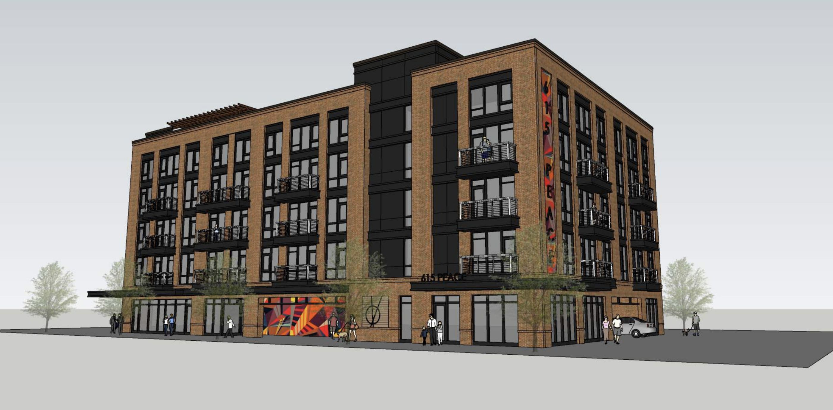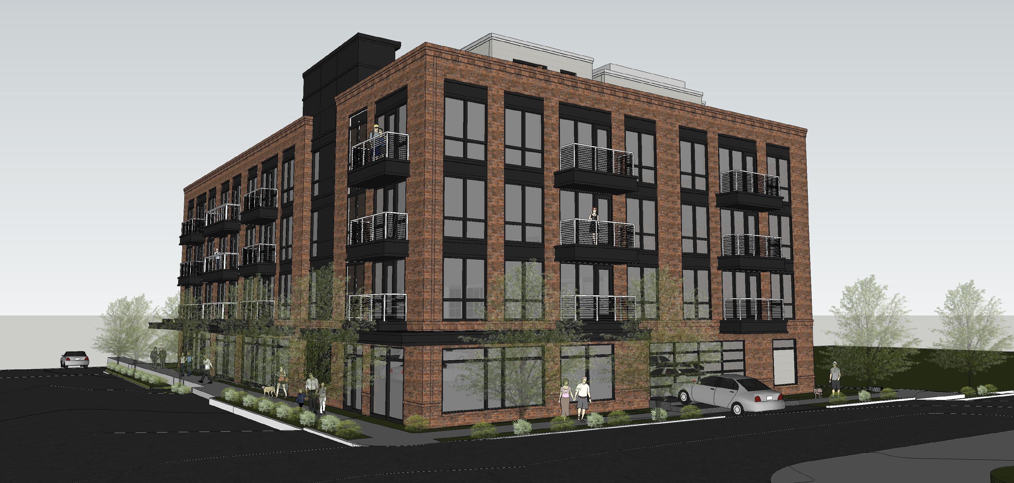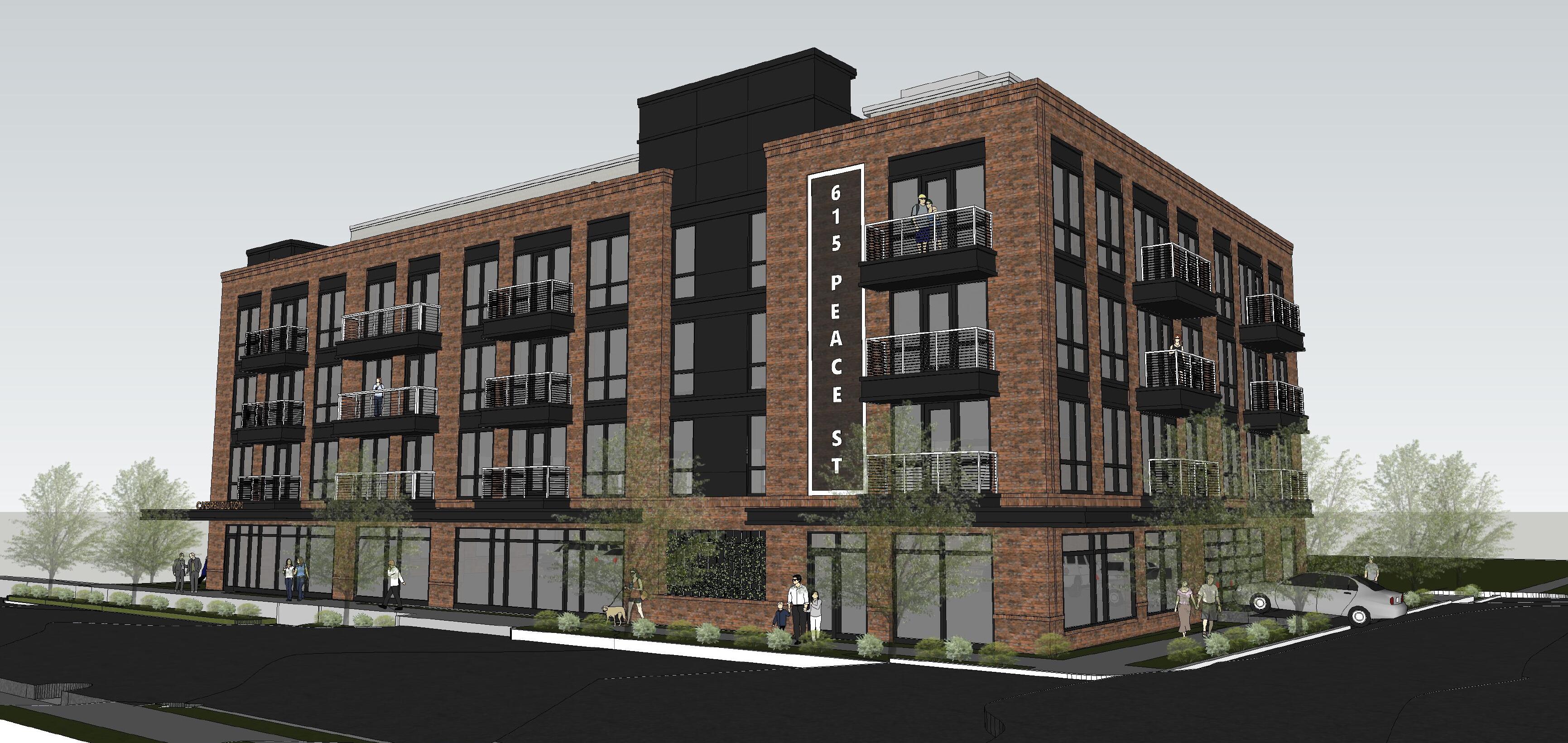This is still moving forward. The building lost a floor though. Looks to be one ground floor retail space facing Peace as well as the building office. Parking entered from Boylan obviously. Floors 2-4 are condos. Rooftop patios. Also, yes primarily brick. Colors though for everything is TBD. Unimportant, but there will also be a basement storage area & utility closet.