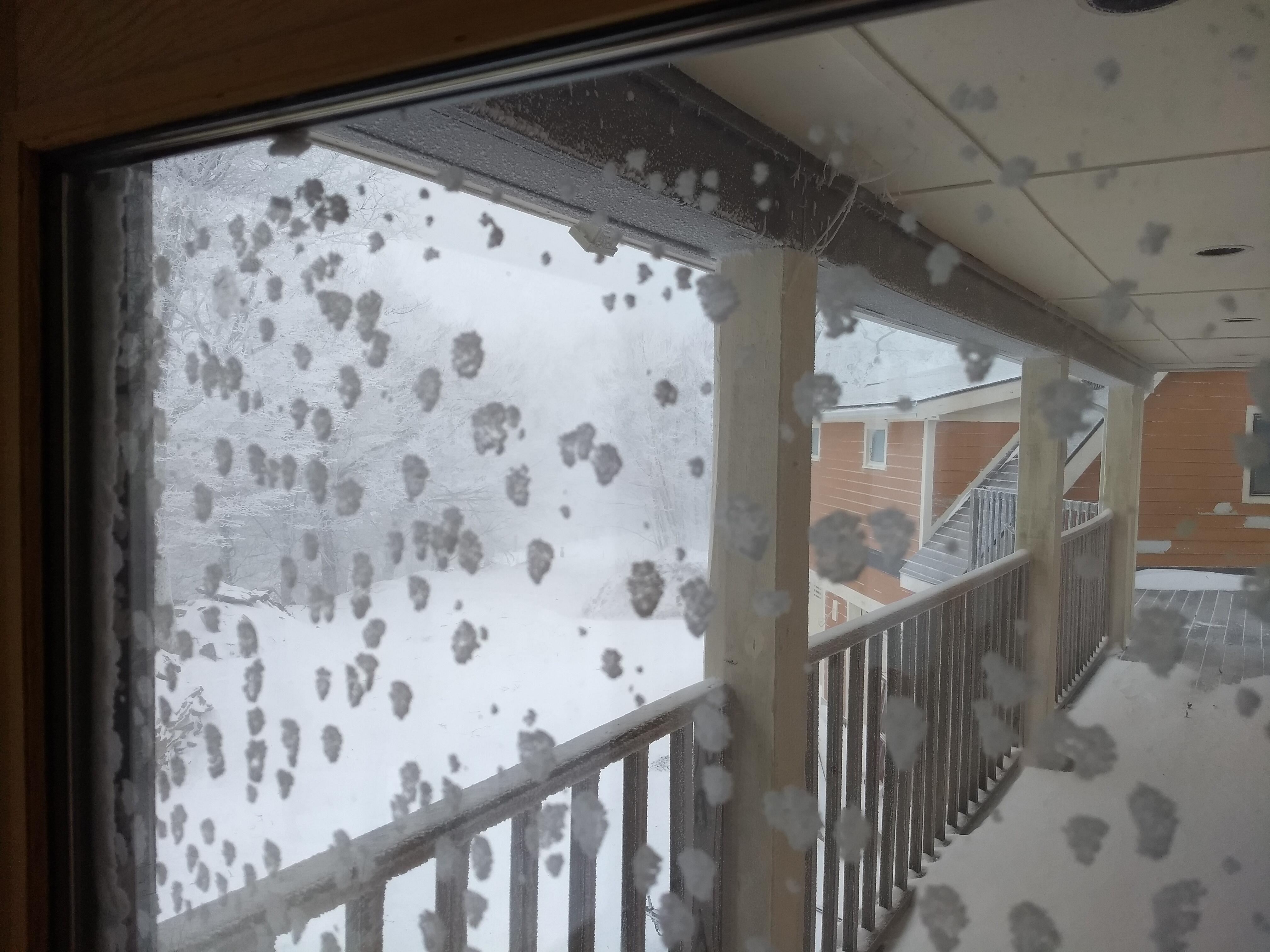 OK here is a snow pic. looking out from second floor of house. Hard to say how much there is due to wind. Everything from none (see decking and garage roof on right) to 4-5ft drifts on drive. Sorry about the snow stuck to windows, due to supper insulated windows and not enough heat gets through to keep snow from sticking to out side.