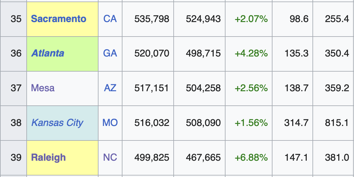 Raleigh’s chances are better with KC because they are both next in line, and they are growing the most slowly. It looks like among the 4 above Raleigh, Atlanta will be the most difficult to pass in the long run. Sacramento has a land issue but they are furthest ahead and Raleigh will have a difficult time catching them if we can’t accelerate our density game. It looks like Mesa is slowing down, but I don’t know what the annexation game is in AZ.