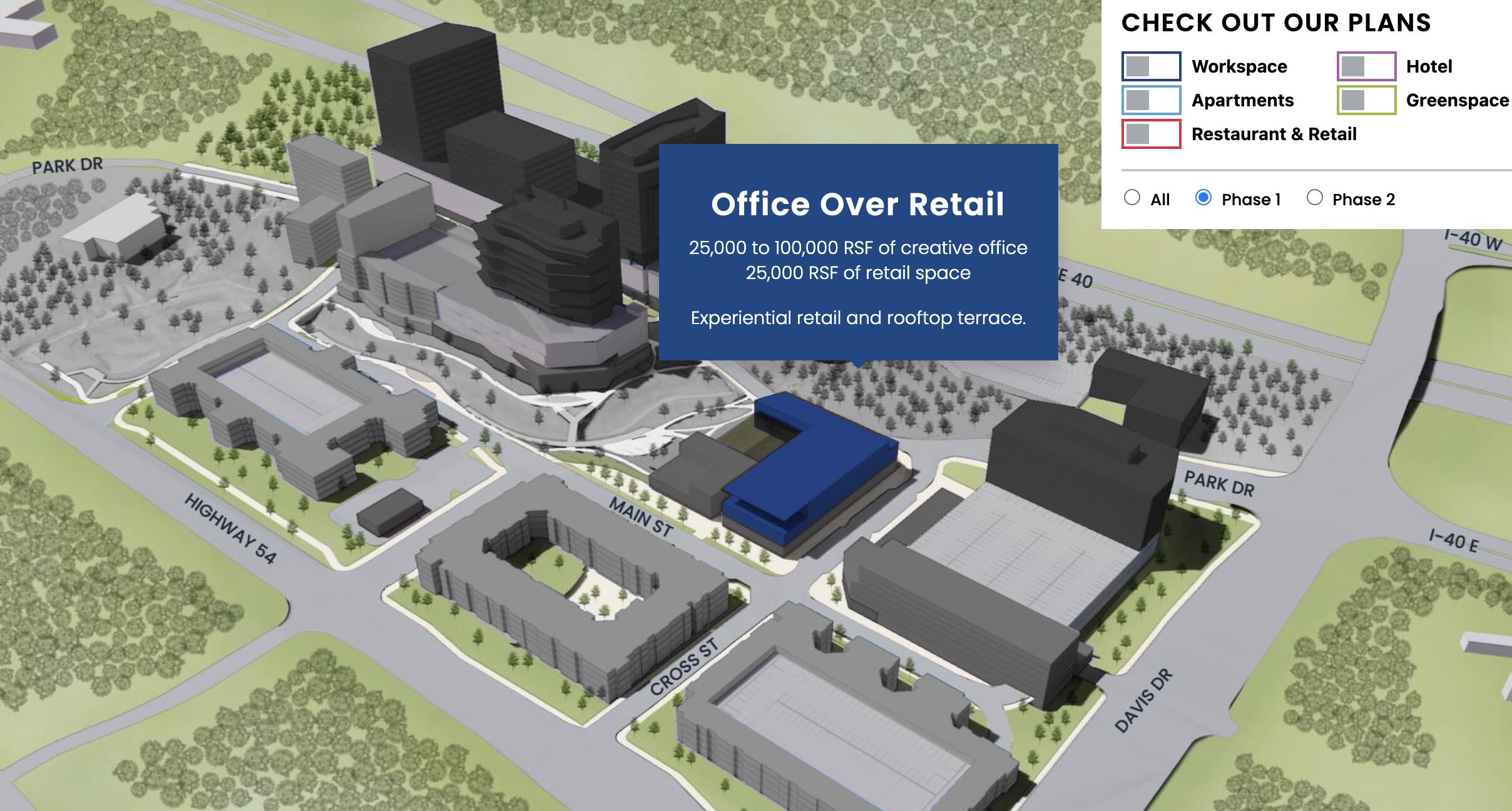 Portion of planned HUB RTP development expanding from 50,000 sq ft to 125,000 sq ft. Will be called the Horseshoe from Charlotte developer White Point Partners.