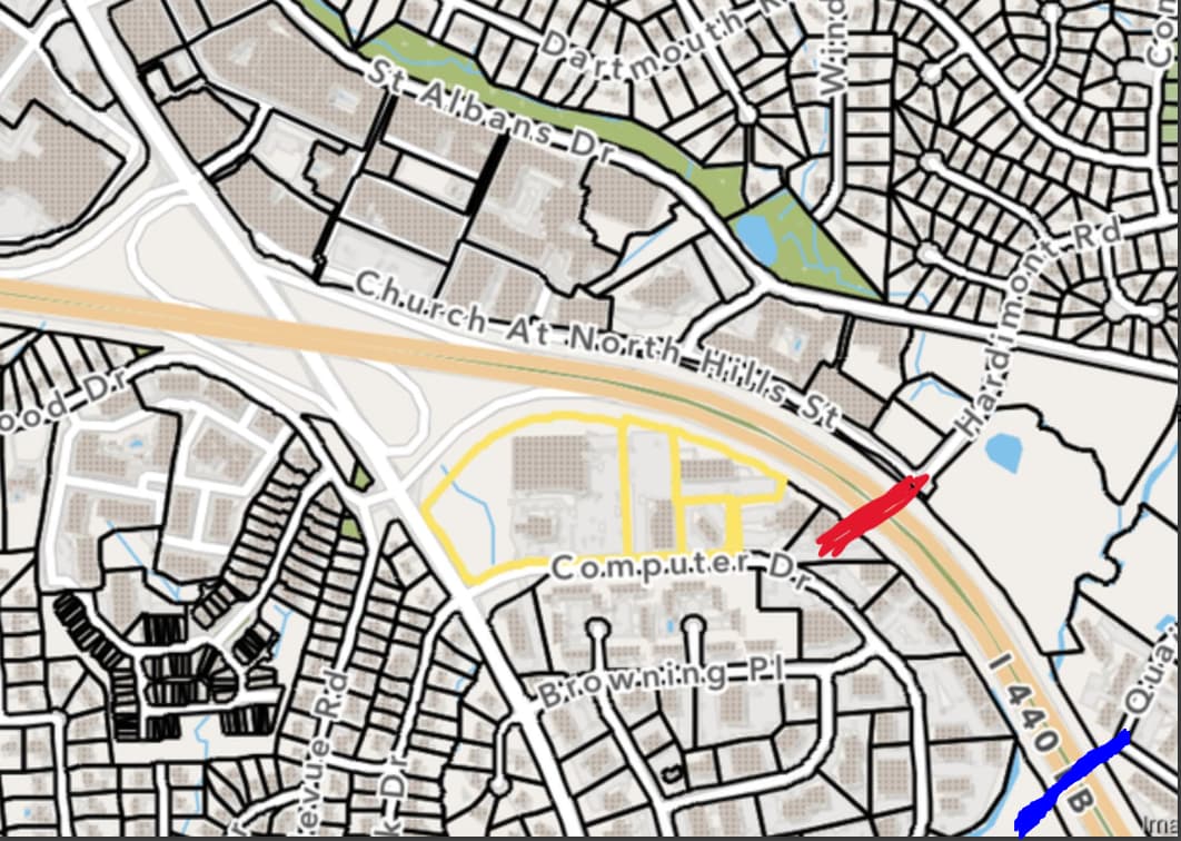 There’s a proposal for a multimodel bridge near here as part of the Midtown plan (?) (blue line), but definitely not ideal for accessing this particular area. I wonder if extending Hardimont over 440 (red line) could be cconsidered instead. Seems like that would be a better placement but maybe there are bigger issues with putting it there and I think the blue line is supposed to be part of the greenway expansion.