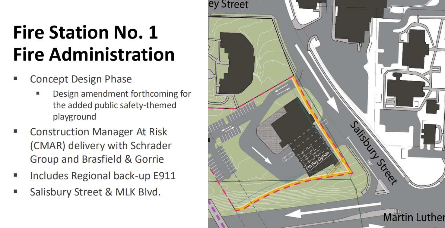 The new Fire Station No. 1 and Fire Administration office to be located at the intersection of Salisbury Street and Martin Luther King Blvd, 820 S Salisbury Street.