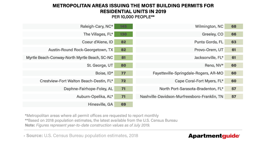 Biz Journal has an article/slideshow referencing an Apartment Guide report about the number of residential building permits issued in 2019. Raleigh-Cary (there’s that small Durham-free MSA again) is 19th overall in terms of pure quantity, but a runaway 1st overall when it comes to permits issued per capita. The only area that comes close is The Villages in FL, which is more or less a planned retirement community on steroids.