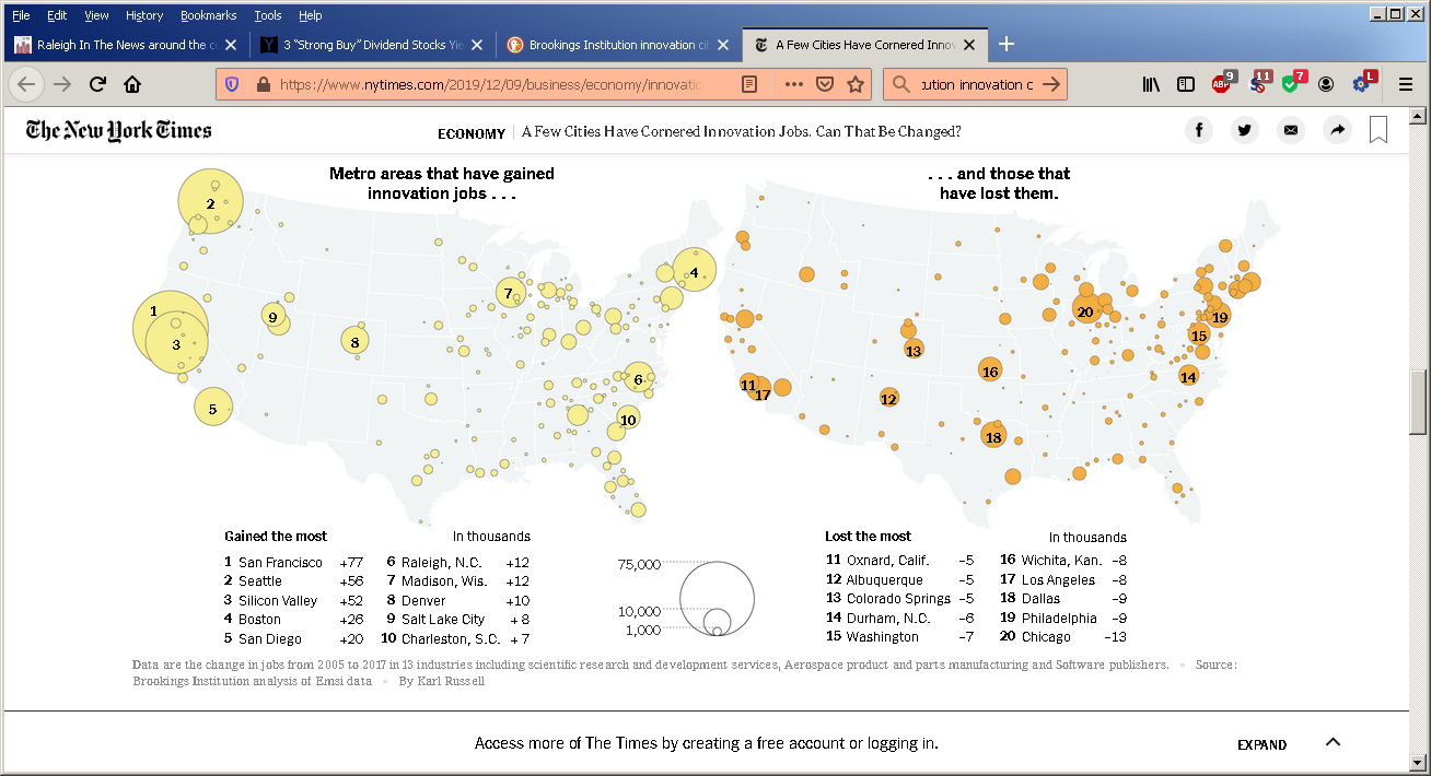 run across this news in that is not behind a pay-wall. The chart below is interesting in that Raleigh is #6 in gaining tech jobs and Durham is listed on city that has LOST the most jobs. Little confusing how that lost ranking is made.