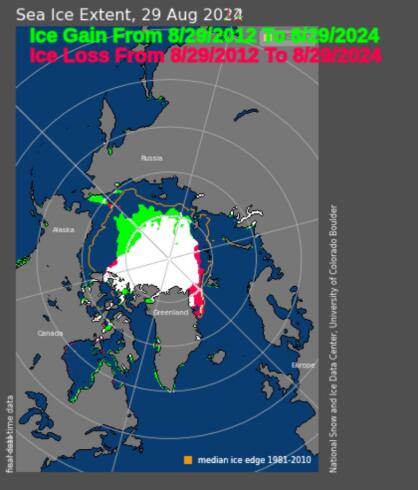 Here is the current Ice gain and loss graph of artic sea ice from 2012 to 2024 by the University of Colorado Bolder.