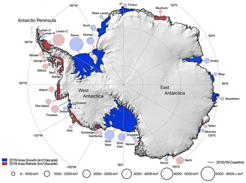 Another graph but this is specifically Antartica from 2009 to 2019 showing 5,305 Sq. KM gain.