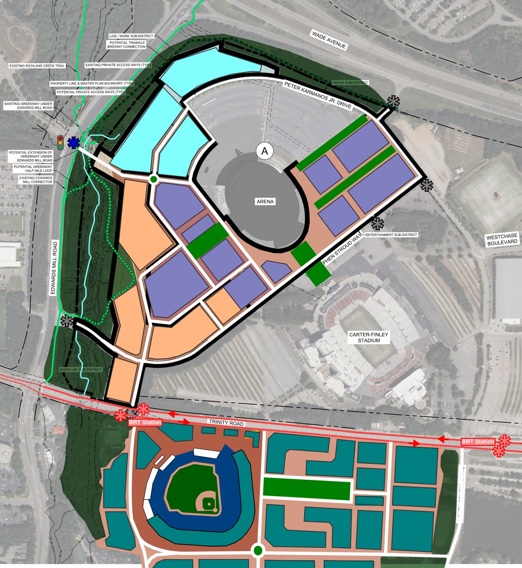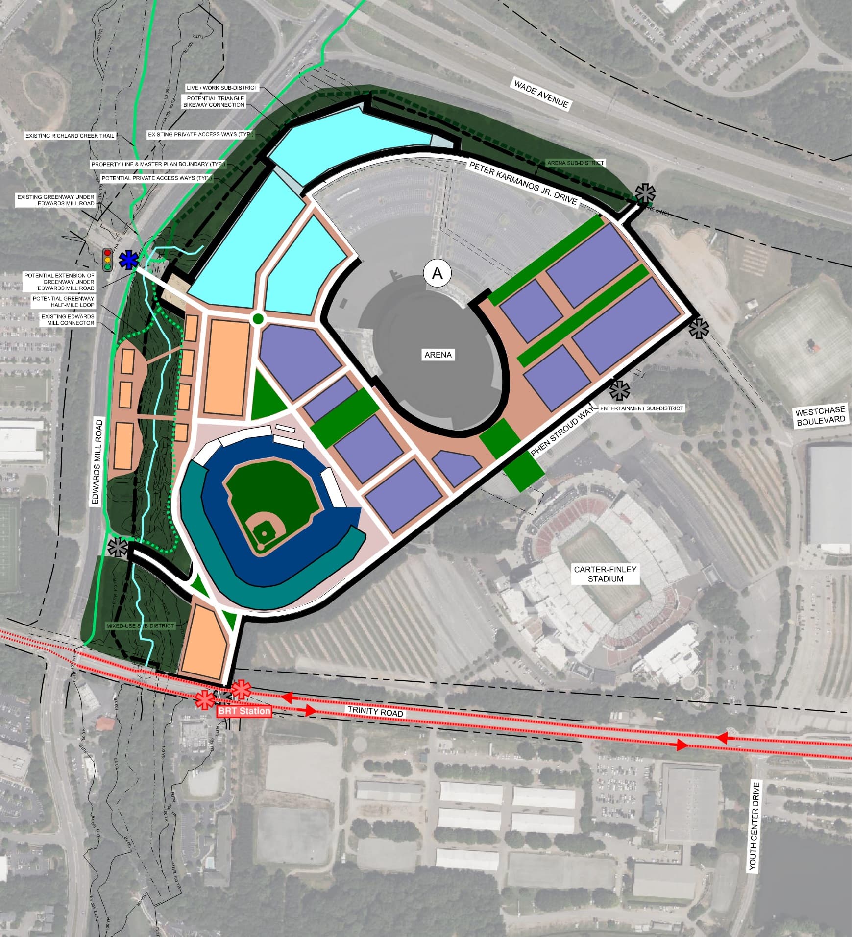 So based on the public comments recently, it seems certain the MLB stadium would be in the Lenovo Center area. I also canât imagine Dundon would want to build TWO whole mixed-use entertainment districts in the same city (in addition to his Lake Crabtree project). So my best guess is it narrows it down to two locations; A) across Trinity Rd at the existing horse complex, or B) next to Lenovo Center.