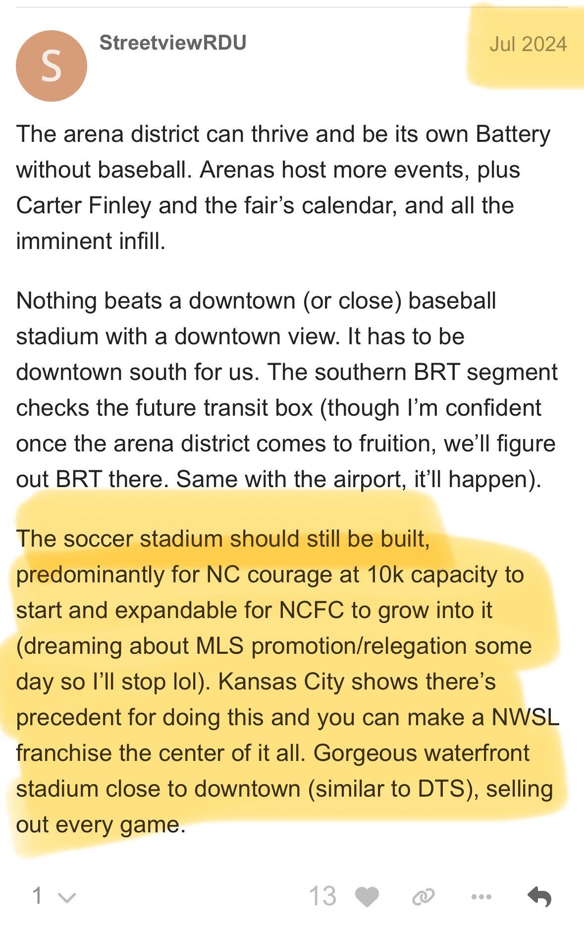 This was all mentioned here two years ago. If you don’t believe the NWSL team valuations, google it. KC had an MLS stadium already. They built a separate stadium for NWSL and it’s been a huge success. This is viable and has always been the realistic outcome for the DTS soccer stadium (prioritizing a venue for the Courage). For those in the back (again), teams only relocate because of stadium issues, only. The Courage needed this or they were going to be lapped by the rest of the league and eventually tempted by an offer to relocate and build a KC or Louisville-esque stadium in a different city. The writing was on the wall even though, sure, they were drawing good crowds at wakemed soccer park. This isn’t a nice-to-have venue, it’s required to keep our top tier women’s soccer franchise. Idc about the impact to NCFC, it’ll obv be good for them, but this is about protecting the Courage.