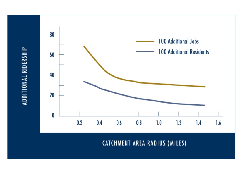 The rendering has almost essentially 0 office development which is a tremendous waste of the land closest to Union Station. Job density drives transit use much more than residential density at any range from the station, but the effect is even more pronounced in the first 1/4 mile - and extrapolating from this graph, exponentially more so at a range of essentially zero. This effect is further compounded by the fact that office buildings hold more people (jobs) per floor area than residential buildings (residents.)
