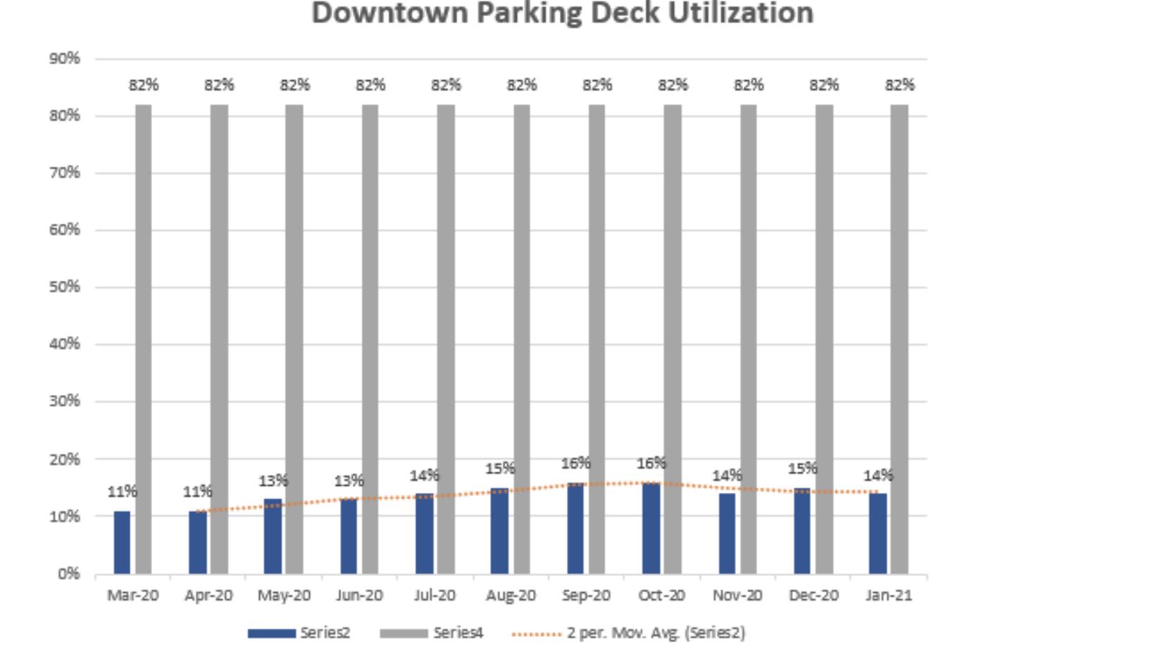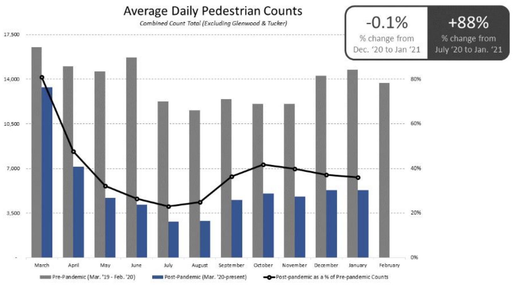 As I said back in March, the city decided to look at bringing back the bus service if parking deck utilization, average number of pedestrians per day, and total food/drink sales recover up to certain percentages of pre-pandemic values. In May (the most recent month with data), we met the latter two out of 3 objectives!