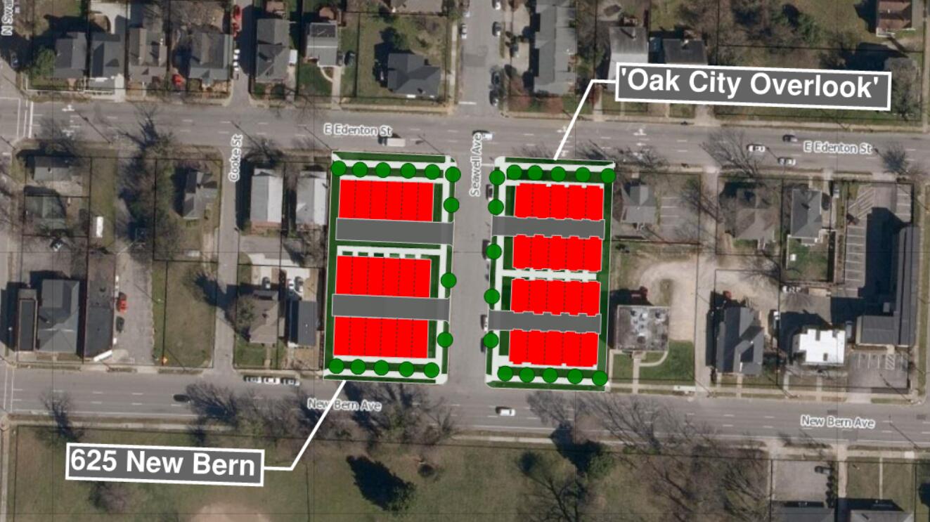 ‘801 New Bern’: 20 townhomes. 2 bedrooms each, 18’x30’ footprints. Four rows with 5 units in each building.