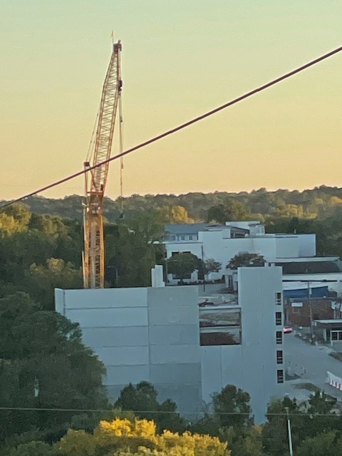 Parking deck starting to peek out over the trees. Also bonus shot of the Platform development crane.
