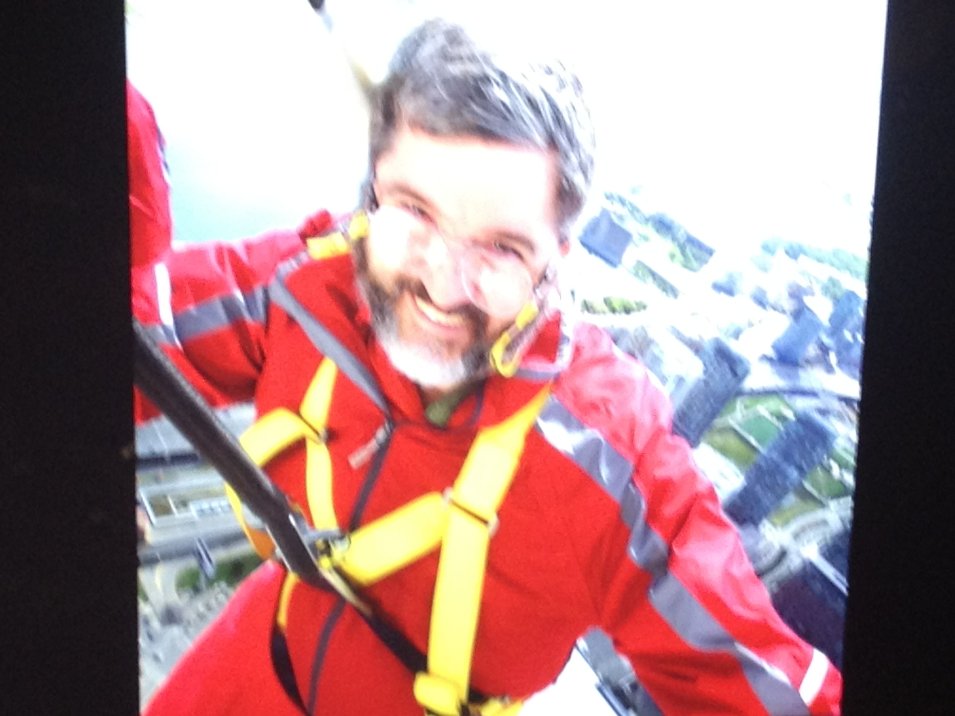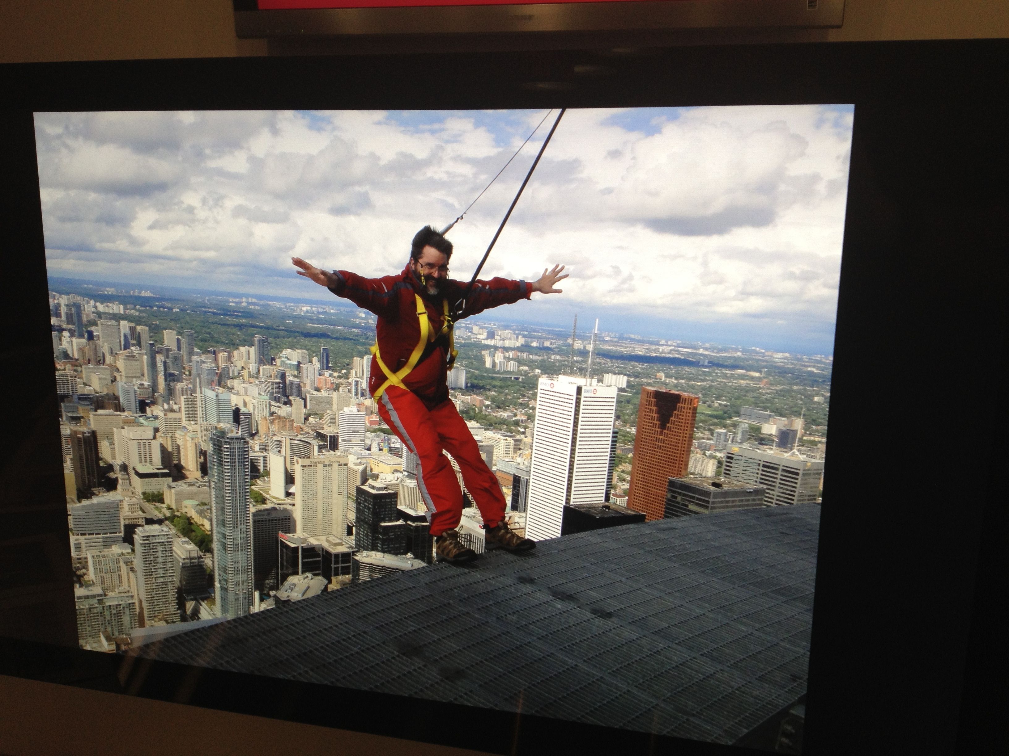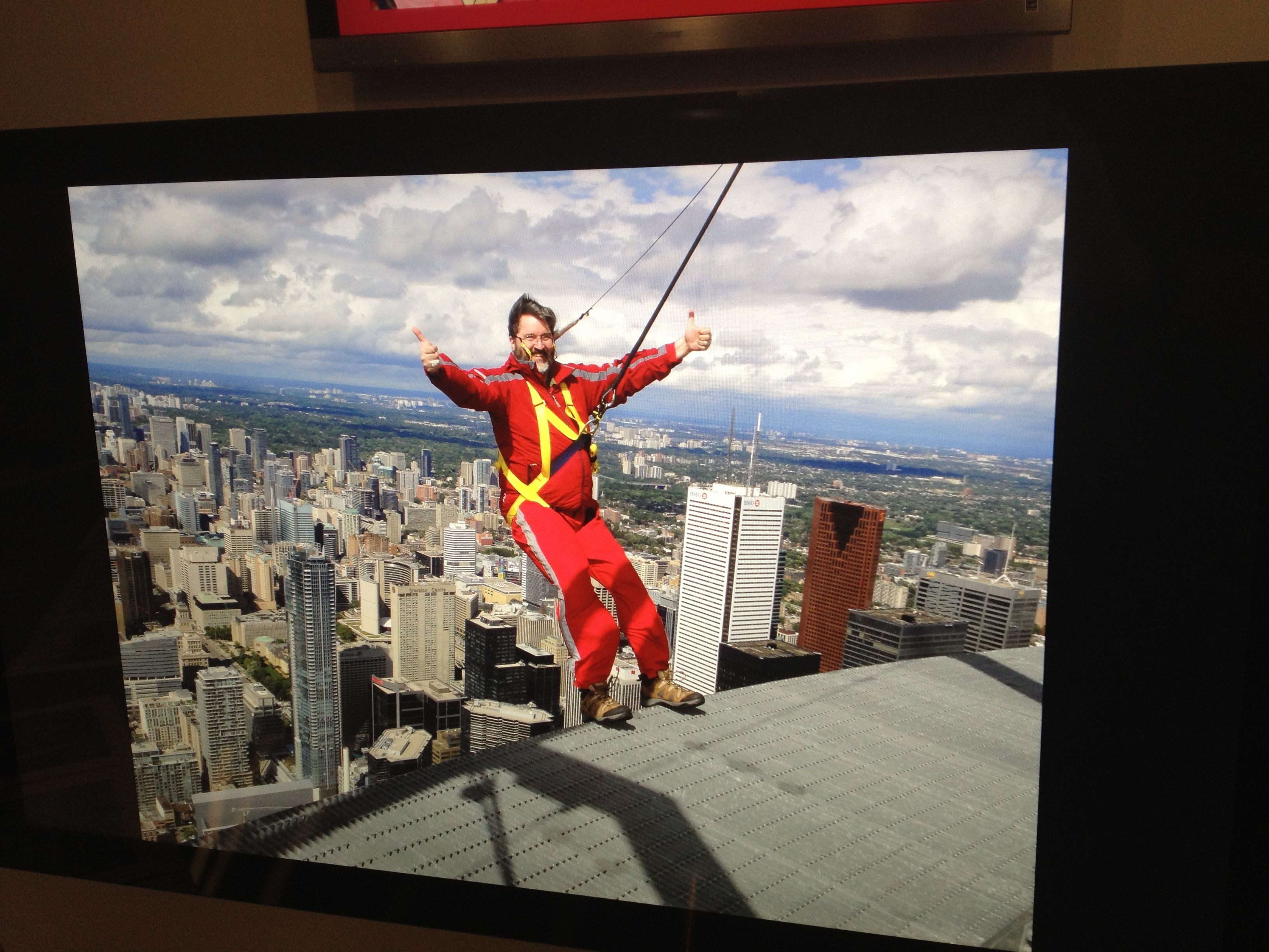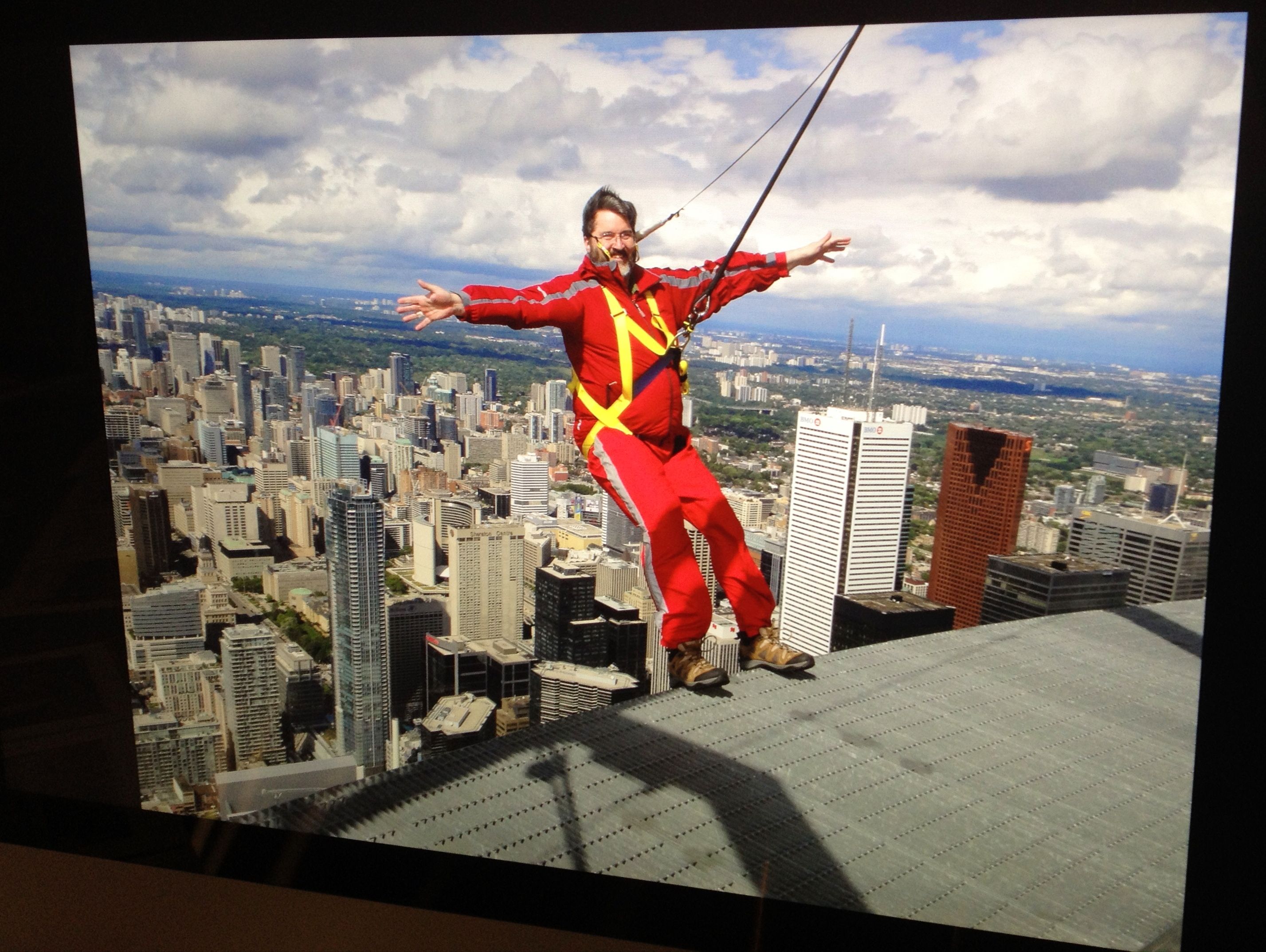 So, after doing ‘Toes over Toronto’ then it was a walk around the edge for a quarter turn, and time to do a ‘Backwards Lean Out.’ That required sitting down in the harness until the slack line was reached, then you slowly shimmied backwards with your butt over Toronto, pushing out and then letting go of the line.