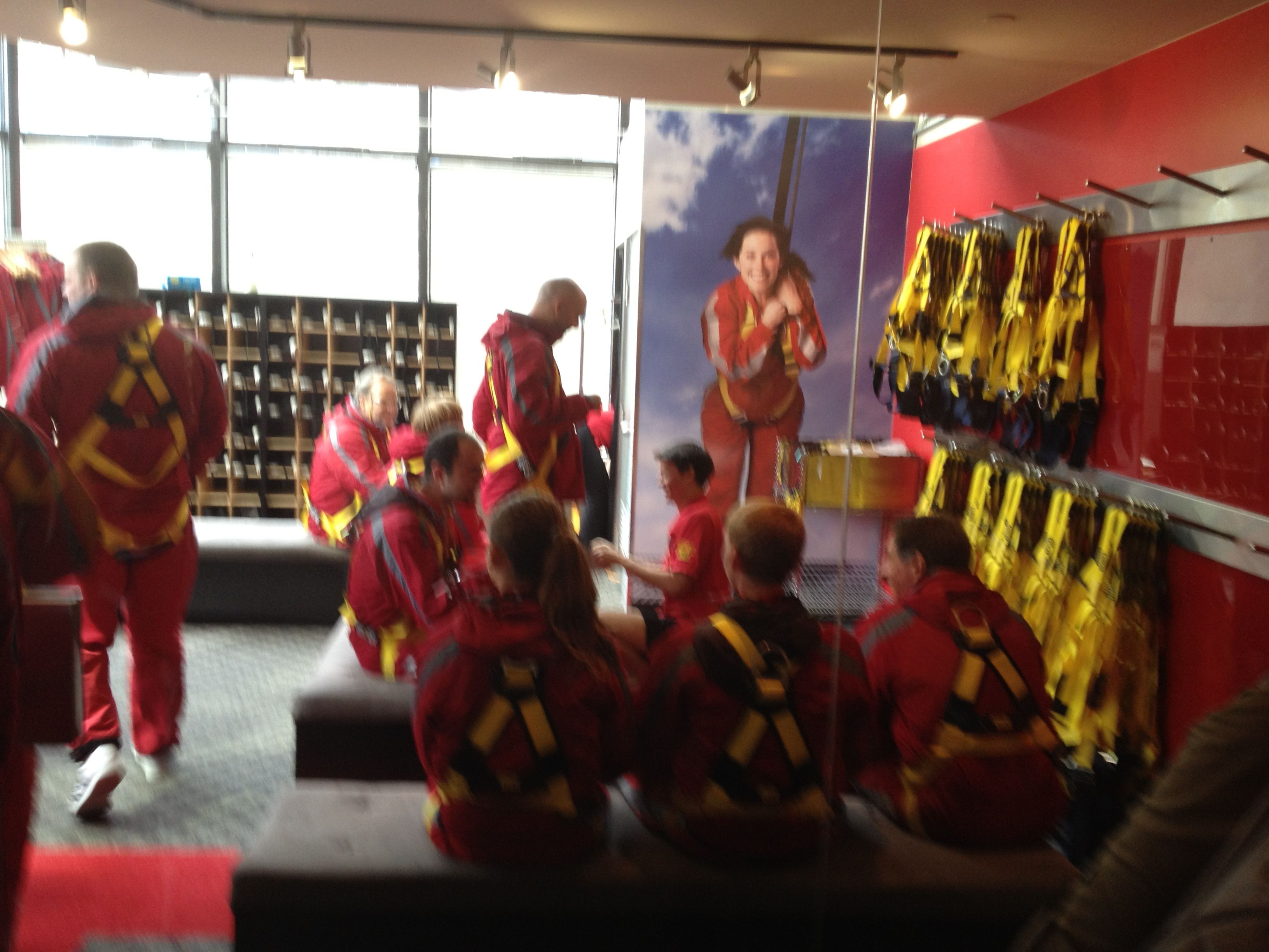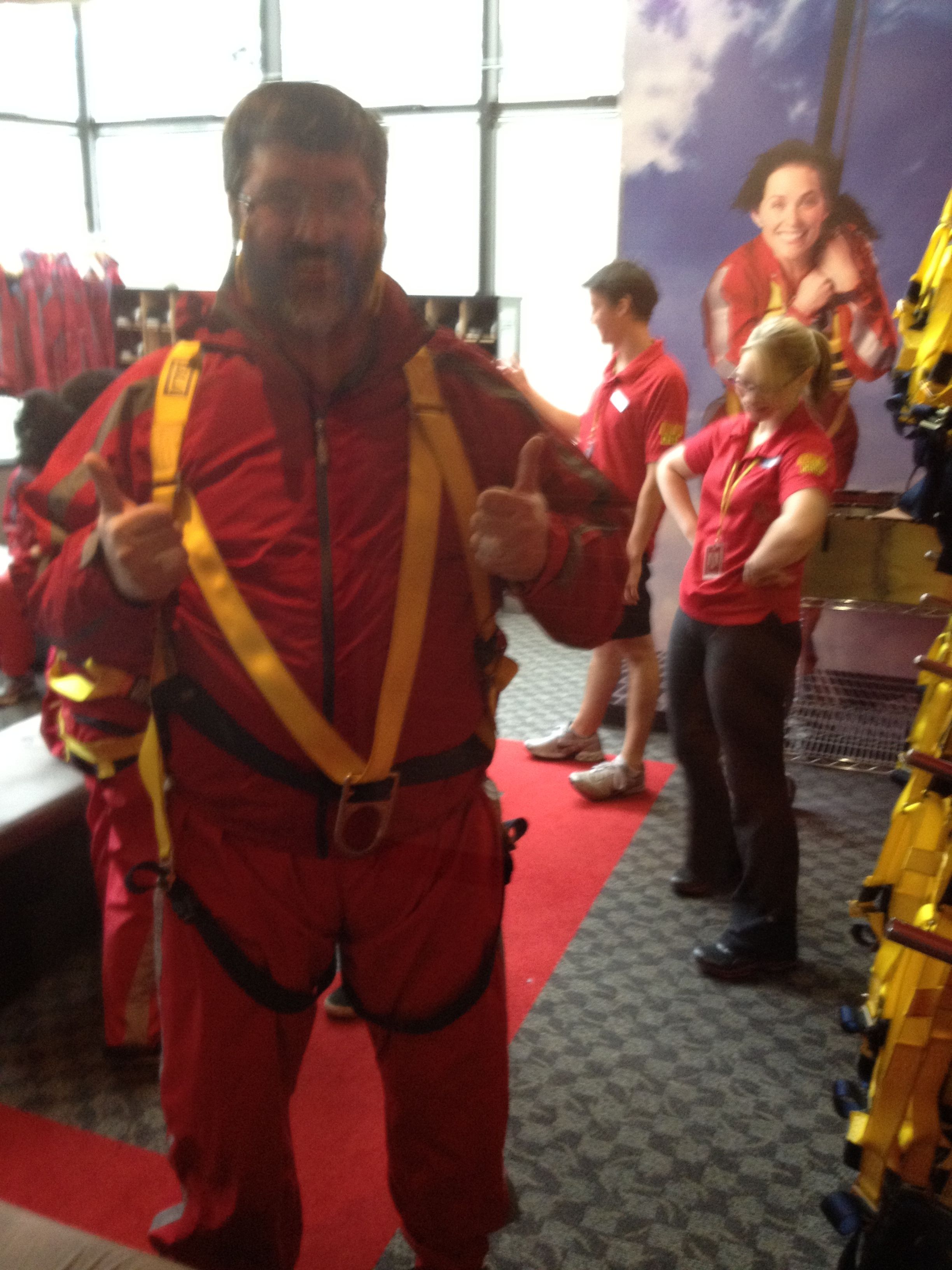 The harness was sewn into the jump suit. And, there was a large D-ring on the front and back. Once all pockets were emptied, wristwatches were taken off and left in a locker, rings were taped over, and eyeglasses were secured with a lanyard while cellphones/cameras were left behind, then it was a quick trip up 1100 feet in a glass bottom elevator.