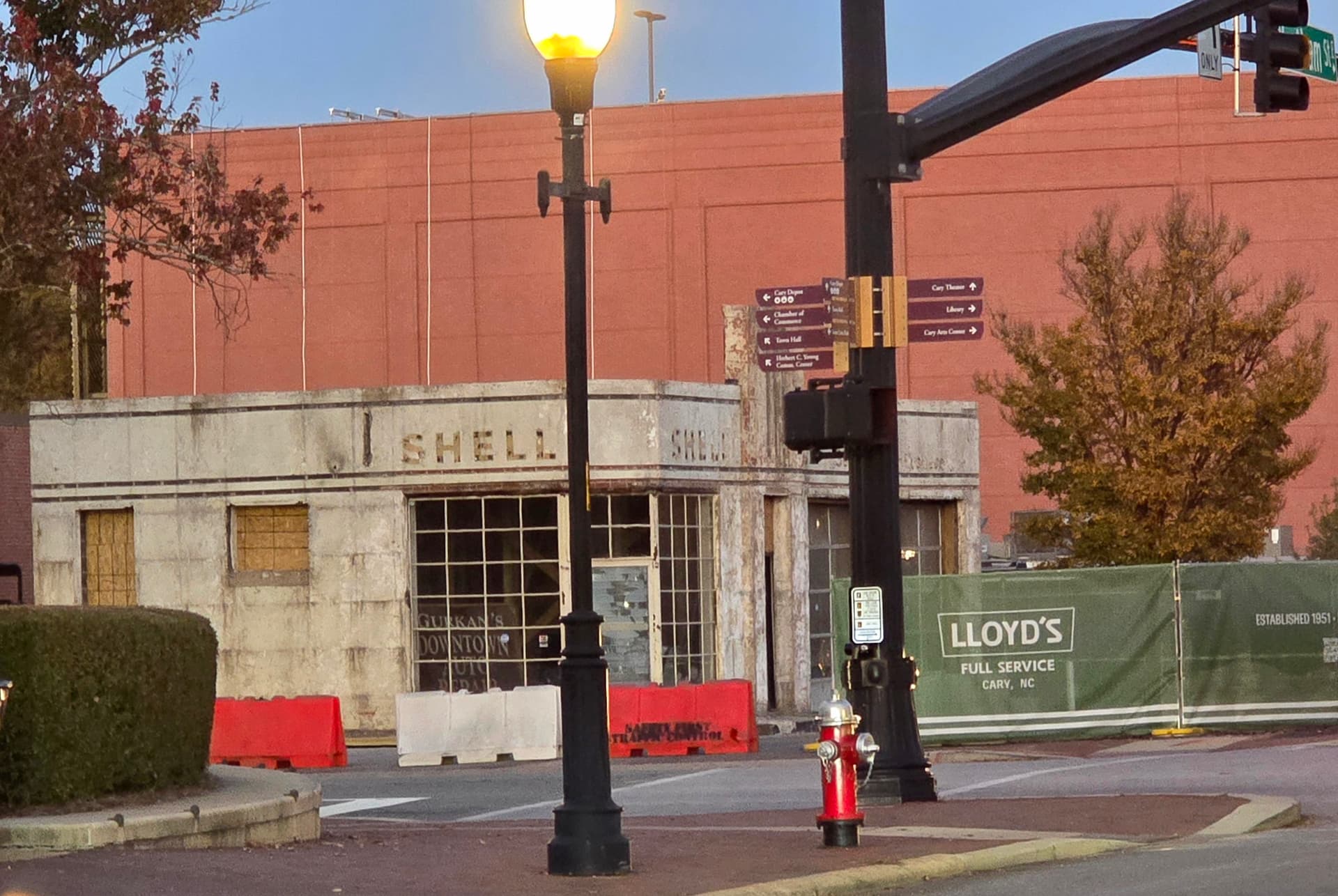 The former downtown Cary service station that is turning into a restaurant has had its more recent exterior finishes removed, revealing the old Shell signs and other details below. This will likely be temporary, so I snagged a picture.