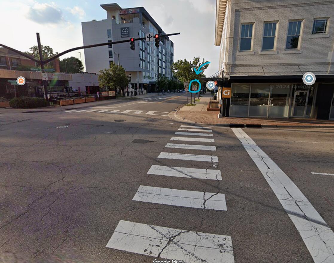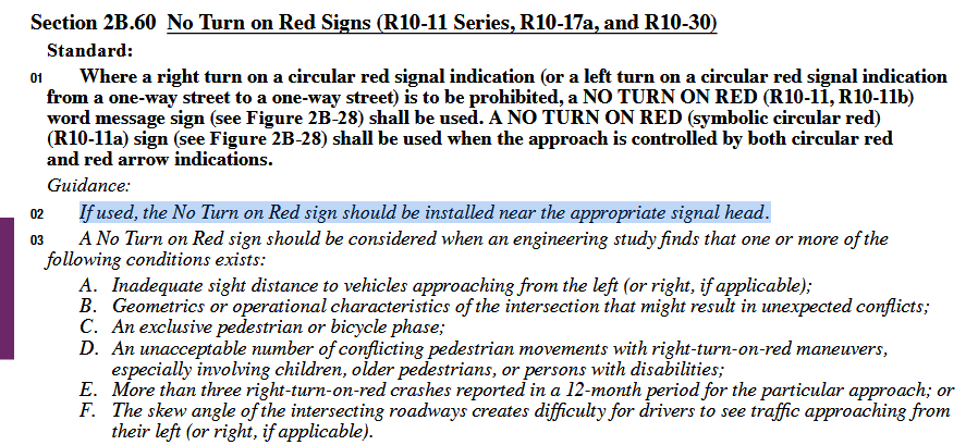 It looks like the signs are installed in similar places at the intersection where your incident occurred. The sign for drivers heading northbound on Glenwood (not the direction of the incident as I understand, but Iām just picking on this one while Iām looking into the topic) is particularly hard to see as it is mounted nearly 30 feet from the curb on the opposite side of the intersection! At first glance these just seem like poor placement, but it also appears to be roughly in line with guidance from the Manual on Uniform Traffic Control Devices (MUTCD) which governs standard signage and pavement markings. It seems like the City is interpreting āthe appropriate signal headā as the pedestrian signal, not the vehicle traffic signal, which makes sense if you assume that a driver turning right would at least glance at the crosswalk theyāre about to drive across. However, Iām not an engineer so maybe this is purely a driver behavior and enforcement issue and there is no better sign placement.