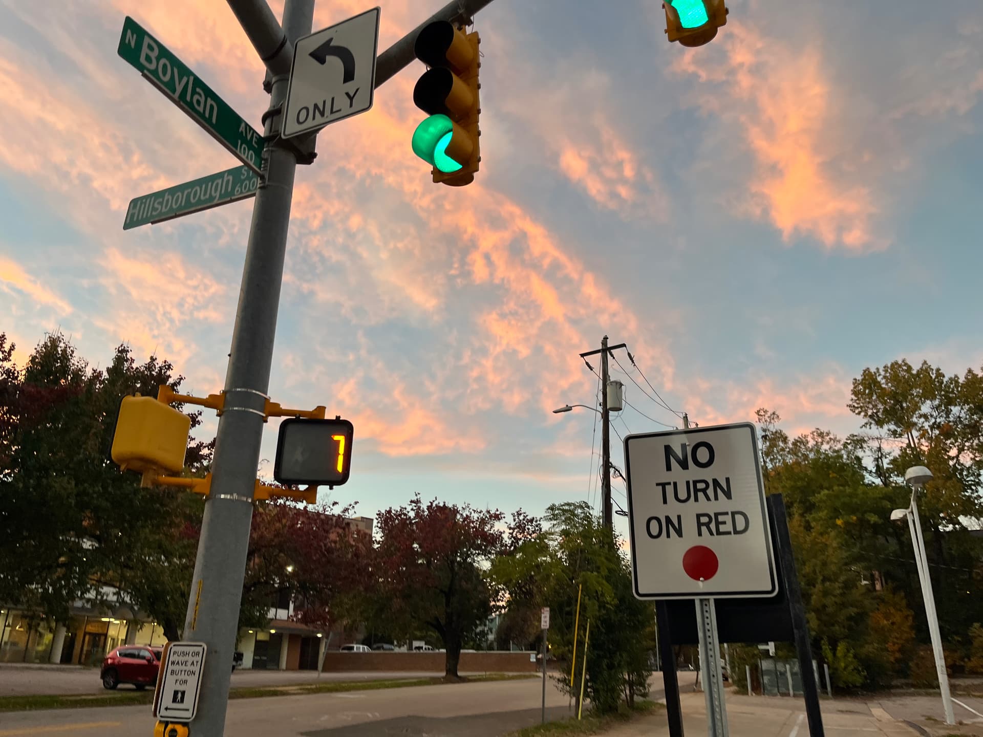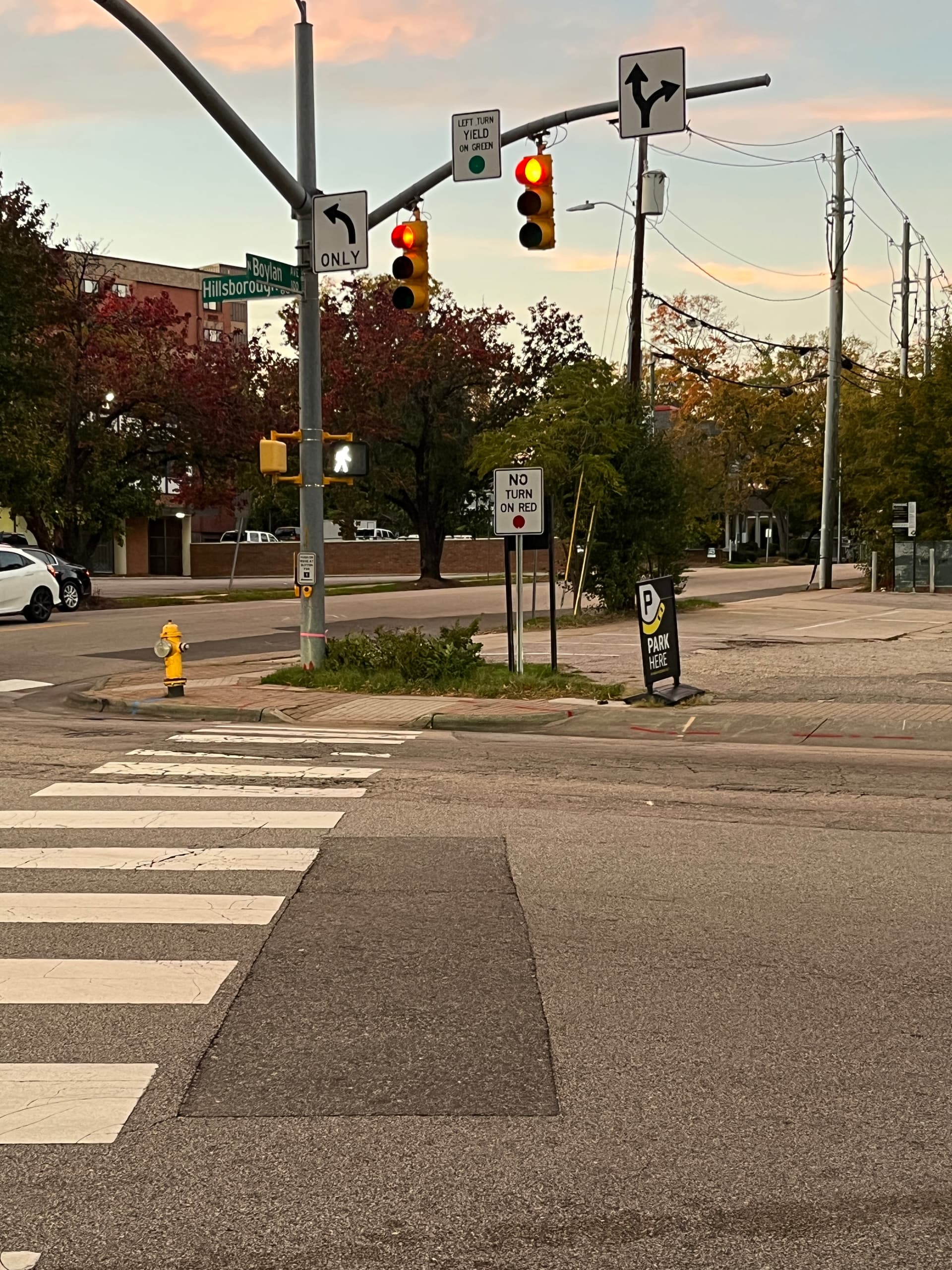 Something dangerous Iāve noticed is unprotected left turns at signals around Cameron Village. I worry someone is going to hit a pedestrian trying to beat oncoming traffic. Those intersections should also not allow right on red.