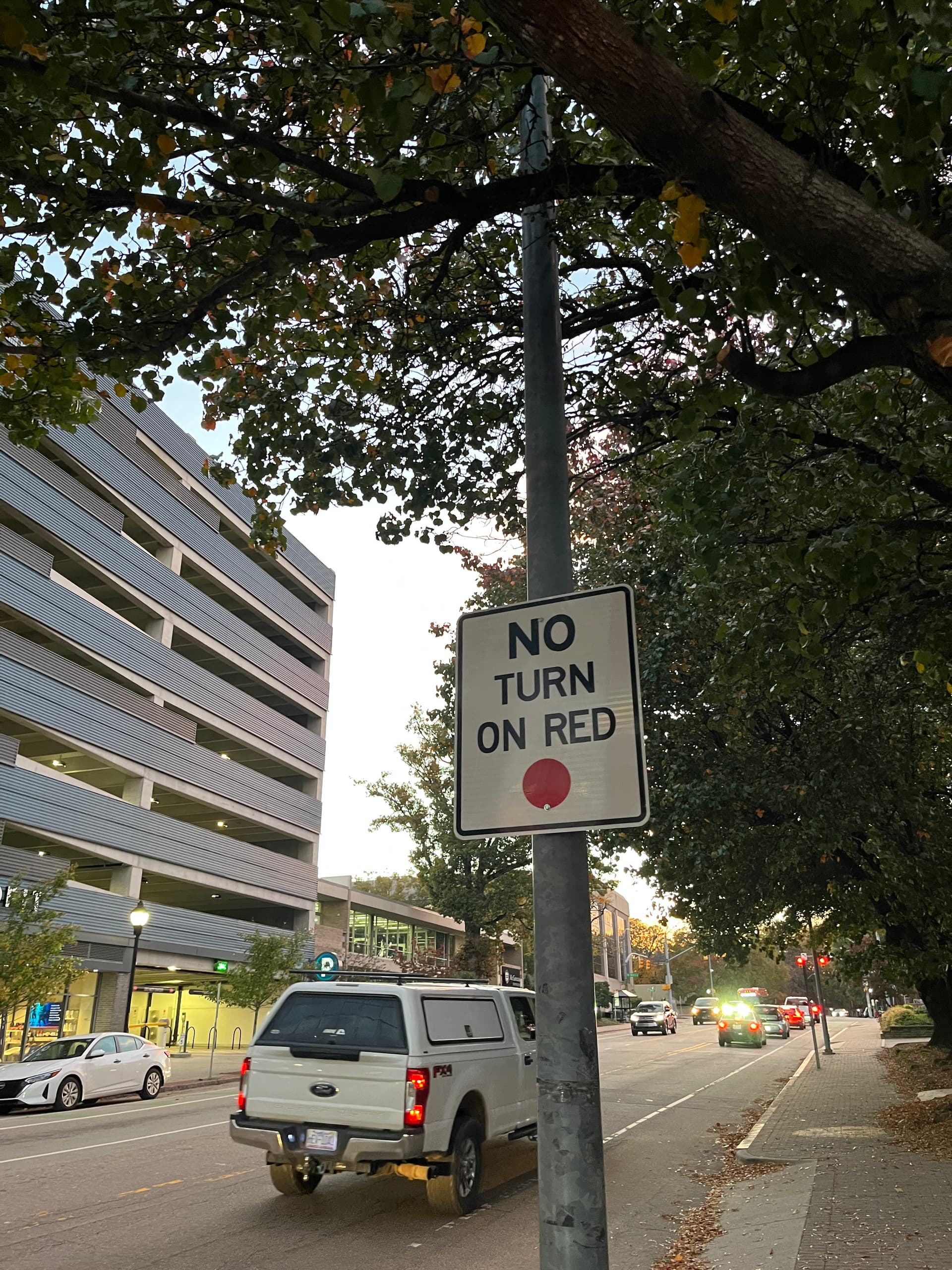 I was actually just talking with a colleague last week who didnāt see the signs at this intersection and made a right turn on red, only realizing after it was too late. She made the point that from the driverās perspective the signs are not always very prominent and are easy to miss, so I took pictures of each. Two of the four were installed on new signs planted in the sidewalk, the other two are on existing poles. I think they could be placed in a location slightly more visible to drivers, but it is also very much on the driver for not paying attention to notice it.