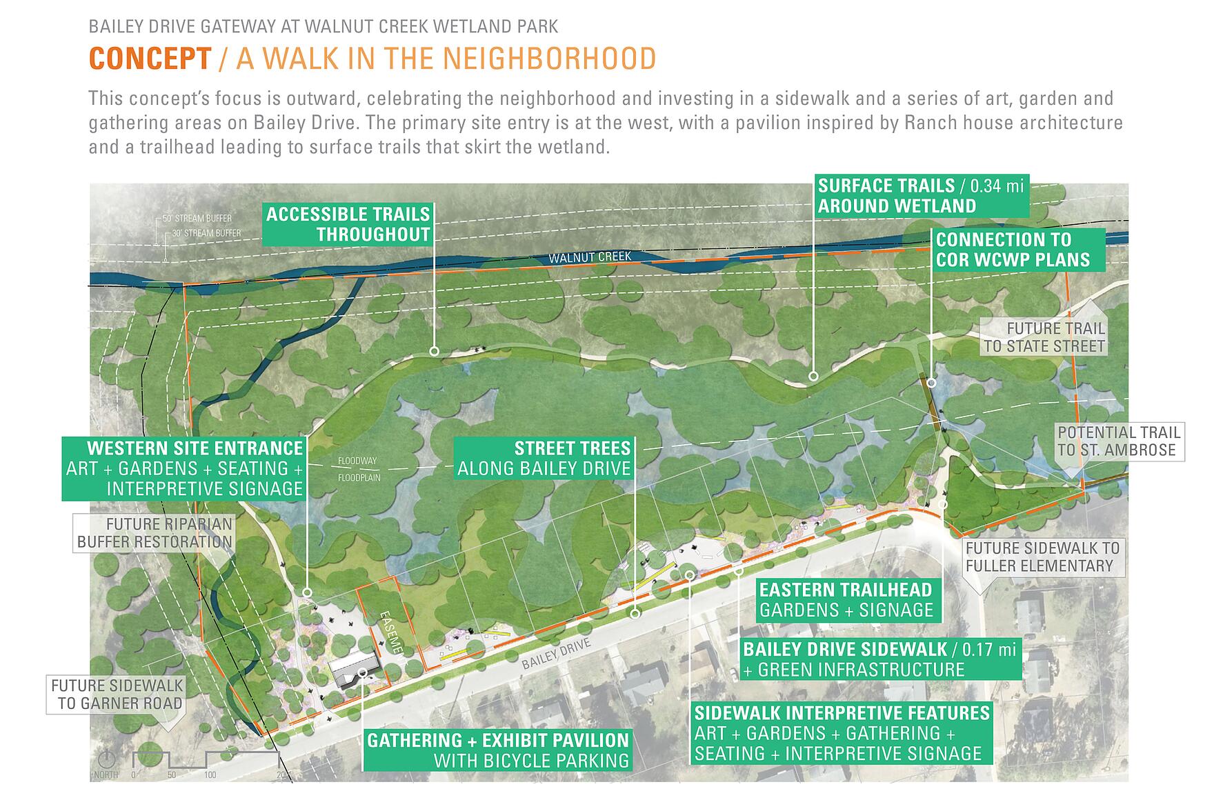 The Walnut Creek Wetland Park is already planned to be upgraded through the city parks bond, and locals were put in charge of designing a way to integrate itself with the wetland and its education center: the Bailey Drive Gateway.