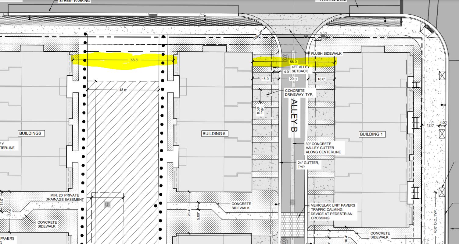 Yea the Raleigh site plan looks a lot better. The alleyway building-to-building distance = 56’, the front courtyard building-to-building distance = 69’