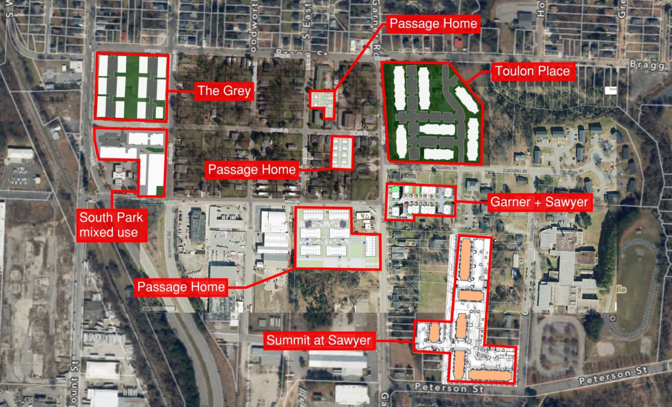 The large lot for the 200-unit Toulon Place at Bragg/Garner has been cleared and new plumbing seems to be in Place. Picture to follow
