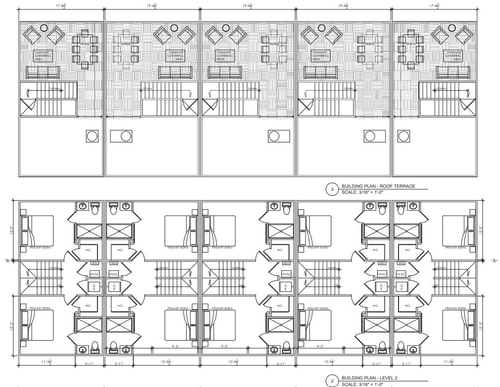 7 townhomes, 2-story with roof top patios, no garages, 5 parking spots